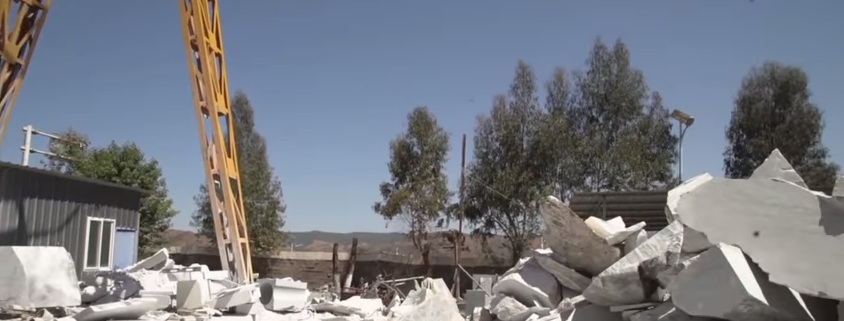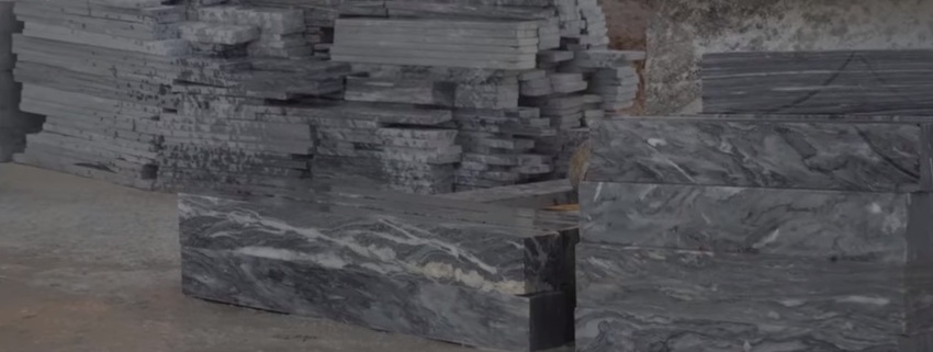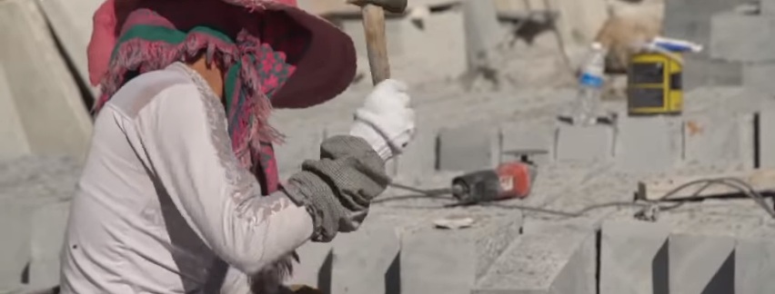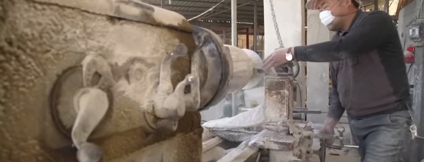 Этот завод в Китае занимается изделиями из мрамора - колонны, плиты и статуи. Рядом находятся горы, откуда спускают мраморные плиты. Здесь их пилят и шлифуют.