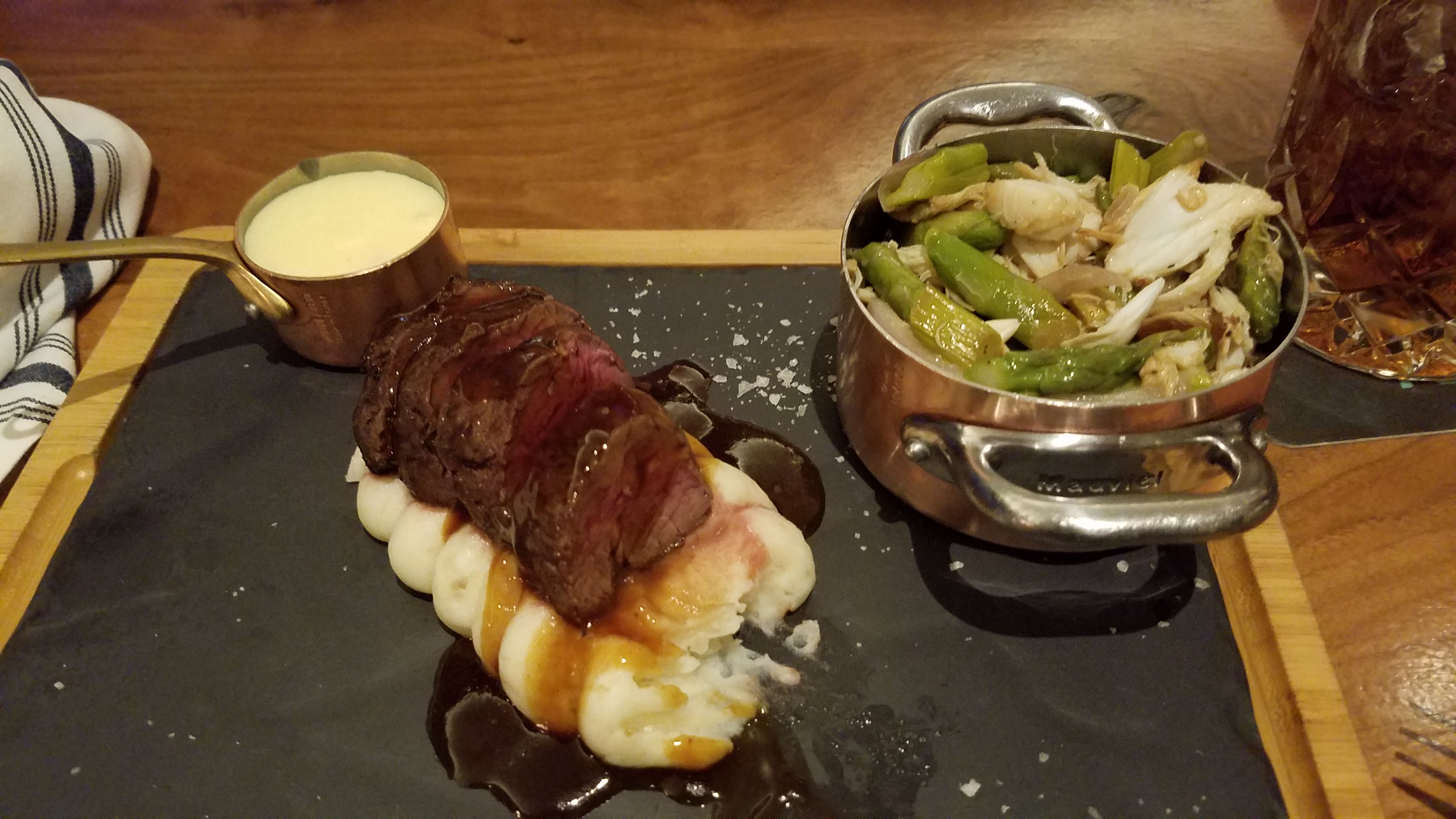 Steak Oscar for me. The bowl has crab meat and asparagus in it. I wouldn't have thought to put them together like that but I ate the whole thing. It was great.