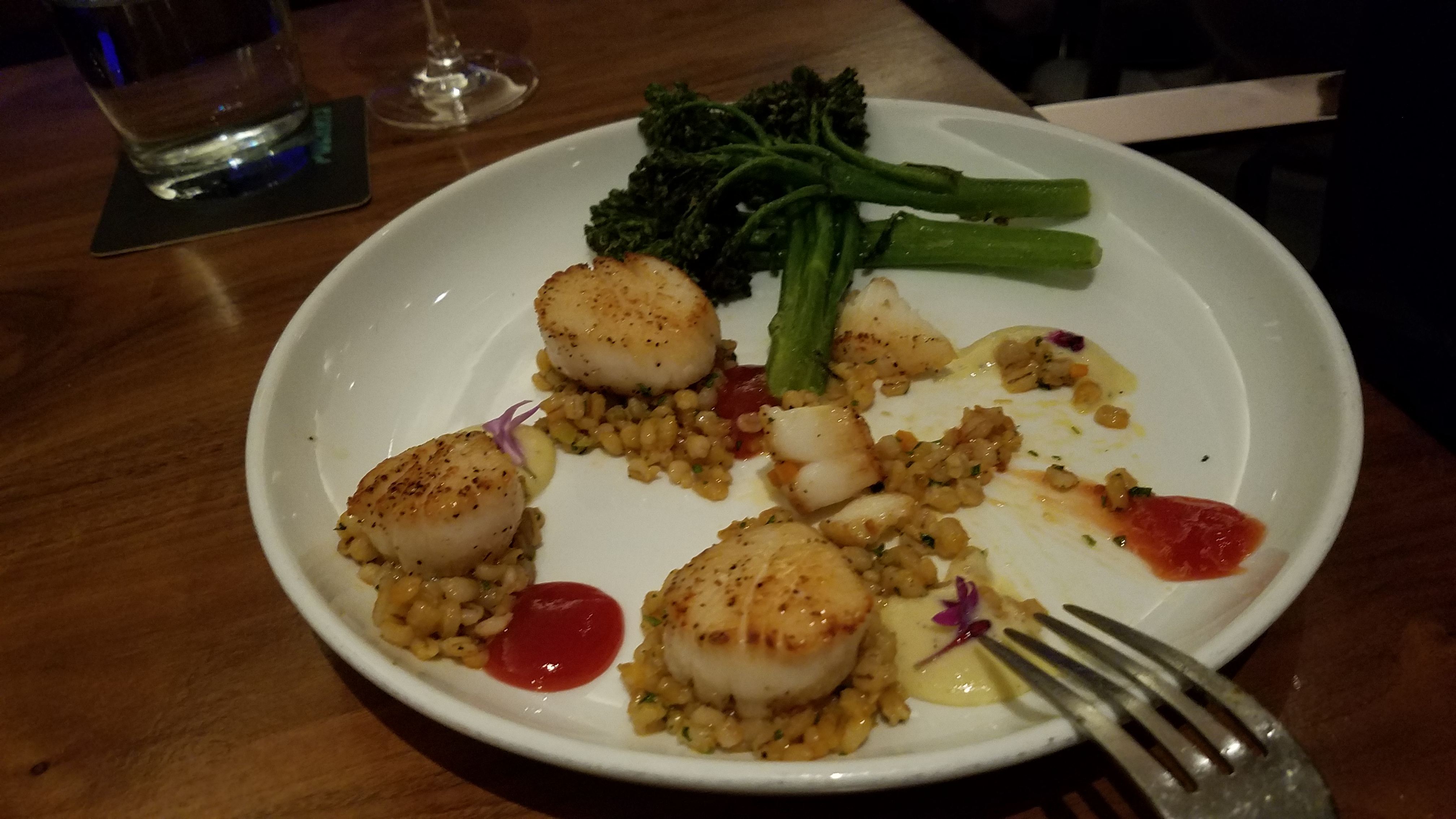 Scallops on barley beds with broccoli rabe for her...