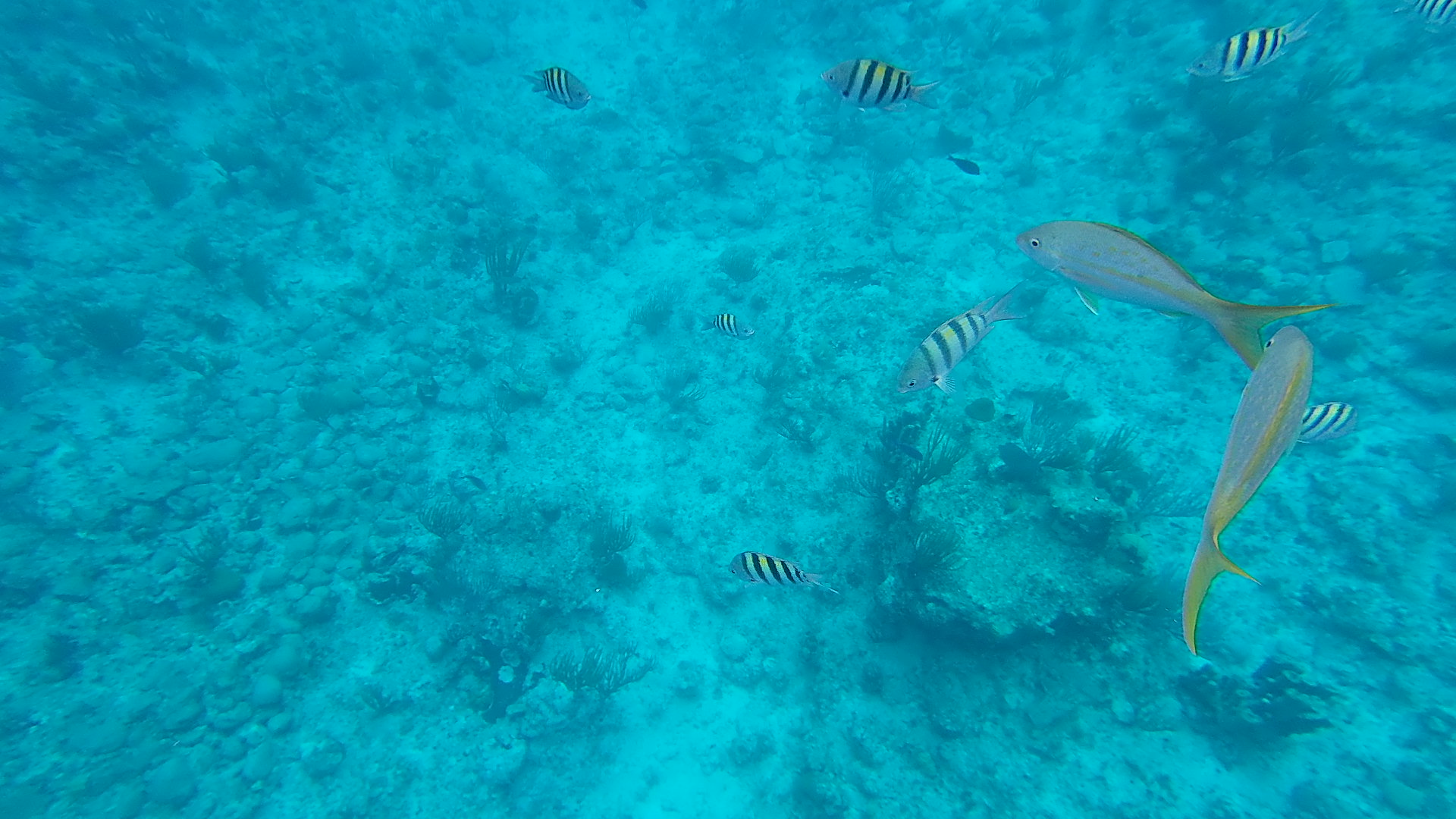 I had seen one barracuda as well as a pufferfish but I wasn't able to take a great picture without diving too far. So here's what I'd say if you come onto this cruise: If you're looking for a beautiful coral reef? Go to Princess Cays' snorkeling excursion. But if you're looking for fish interaction than come to Grand Turk's snorkeling excursion. Afterward, they sail to a small island so you can party, listen to music, and drink rum punch on the shore. It was really fun!