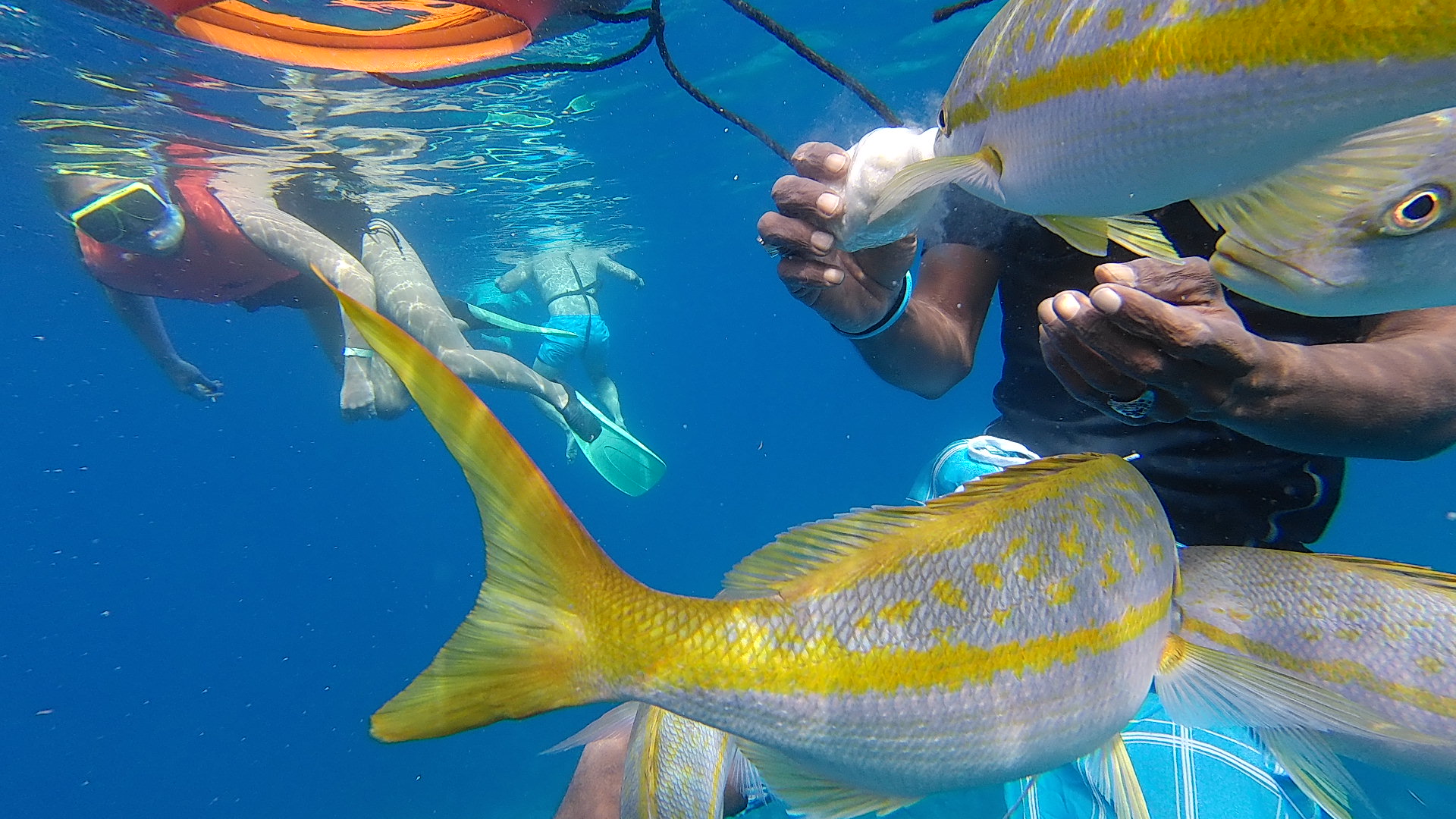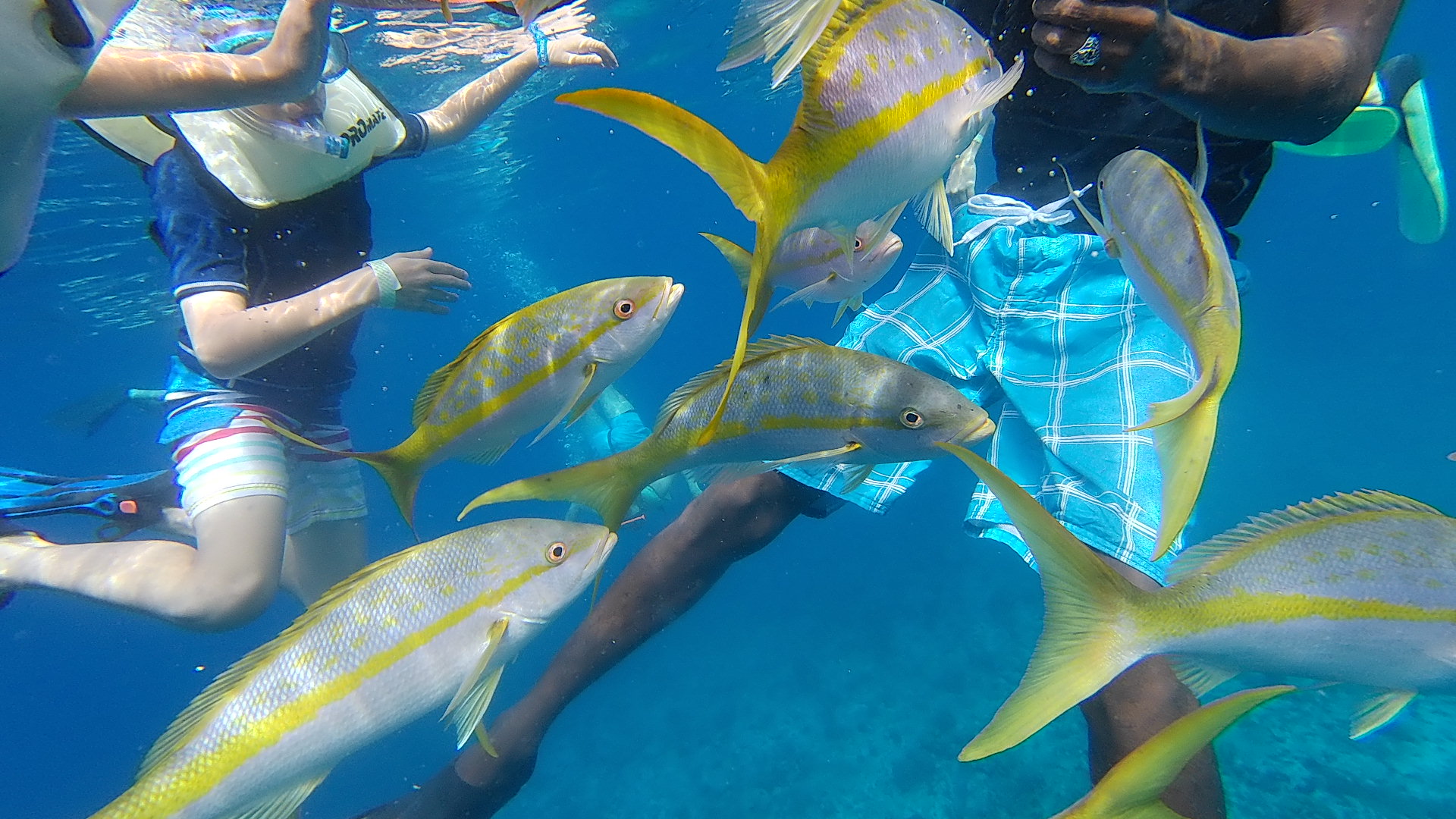 As I had been swimming and getting used to the colder water I see a whole school of yellowtail snappers all surrounding one of our guides. On closer inspection, I see him holding a bottle full of some sort of fish food that they just loved. A few people started surrounding him to touch the fish and it became harder to take pictures so if you're wondering what's with the crowd of people, that's why. ^^; They were beautiful though, it's probably the first fish that I've seen up so close and personal before. Most of the fish back in Hawaii would turn tail and swim away, but here they seemed friendly and knew that the people here meant them no harm. (And free food, right?)