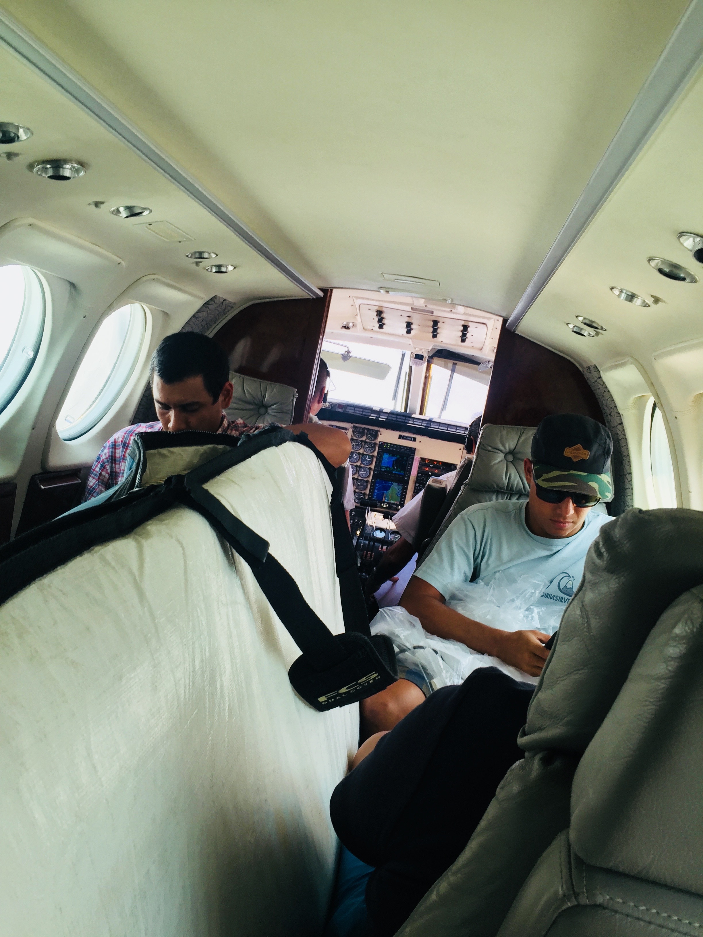 Us in this 6 passenger small plain with our surfboards right in the middle of everything, the boards were almost touchings the pilots. Was a whole challenge for the pilots to get into their seats.