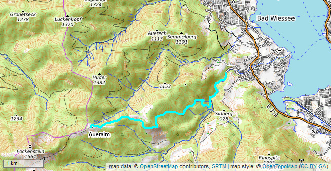 Die Aueralm oberhalb von Bad Wiessee hat Mittwochs bis 22 Uhr geöffnet. Eine gute Gelegenheit für eine kleine Abendwanderung an einem schönen Sommerabend. Der Aufstieg dauert nur ca. 1,5 Stunden. Die Strecke ist auch sehr gut für Mountain-Bikes geeignet.