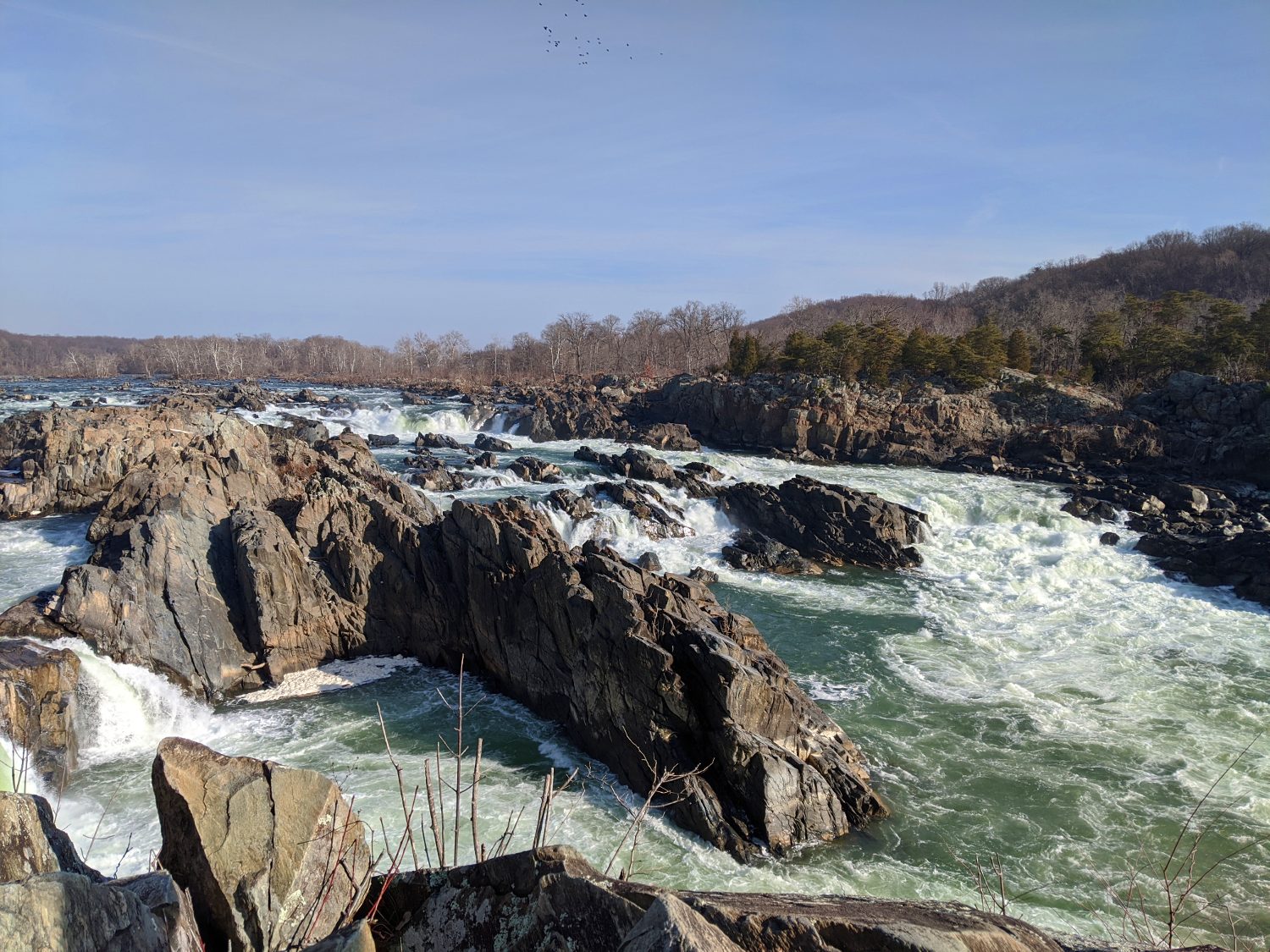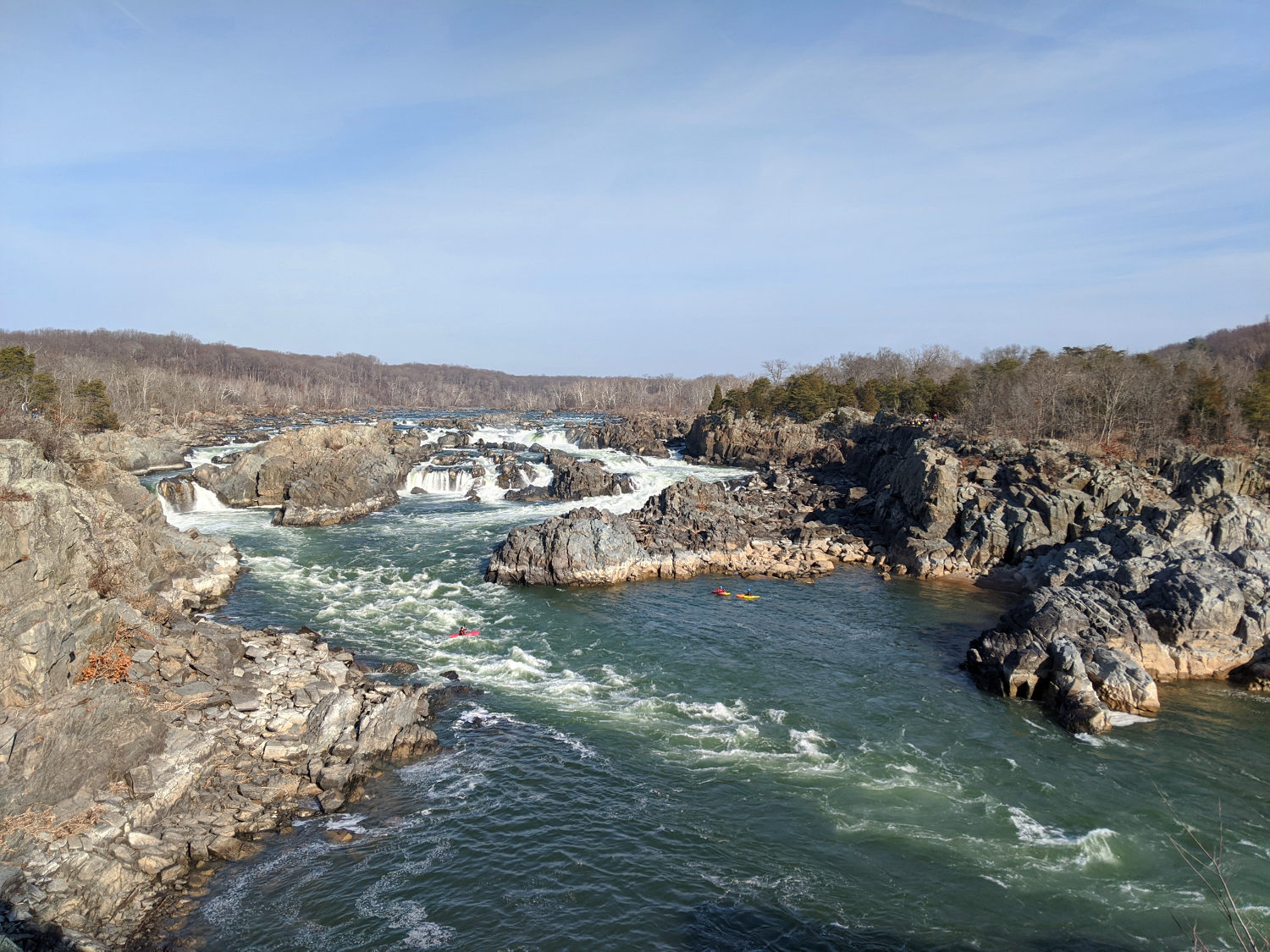 Great Falls is a portion of the Potomac River near Washington, DC. The river drops 76 feet in less than a mile down a series of cascades and through Mather Gorge