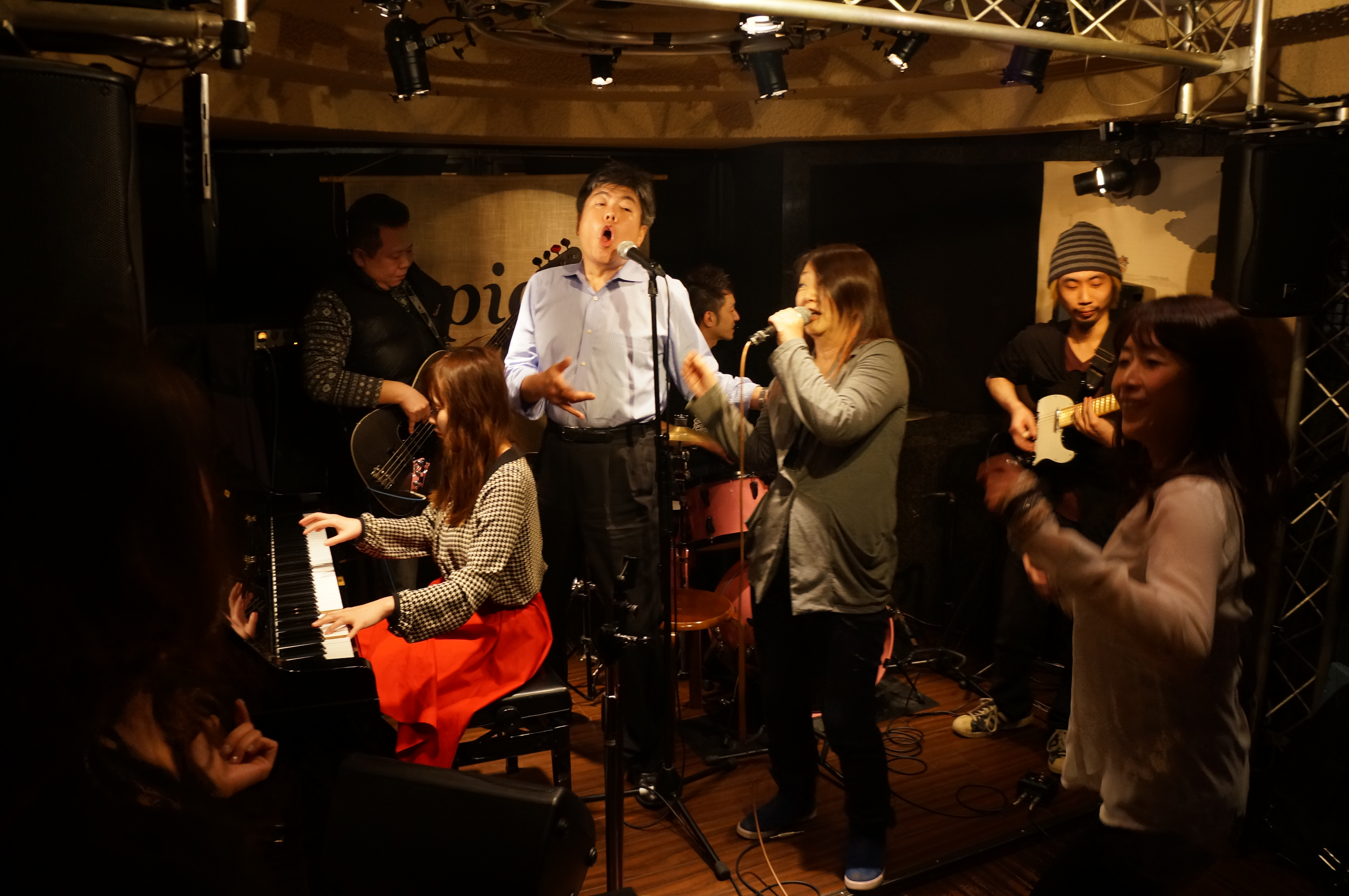 Our friend told her to relax while other people were picking up instruments also and 5 minutes later a complete band was formed with my girl as a lead singer and our friend on the piano