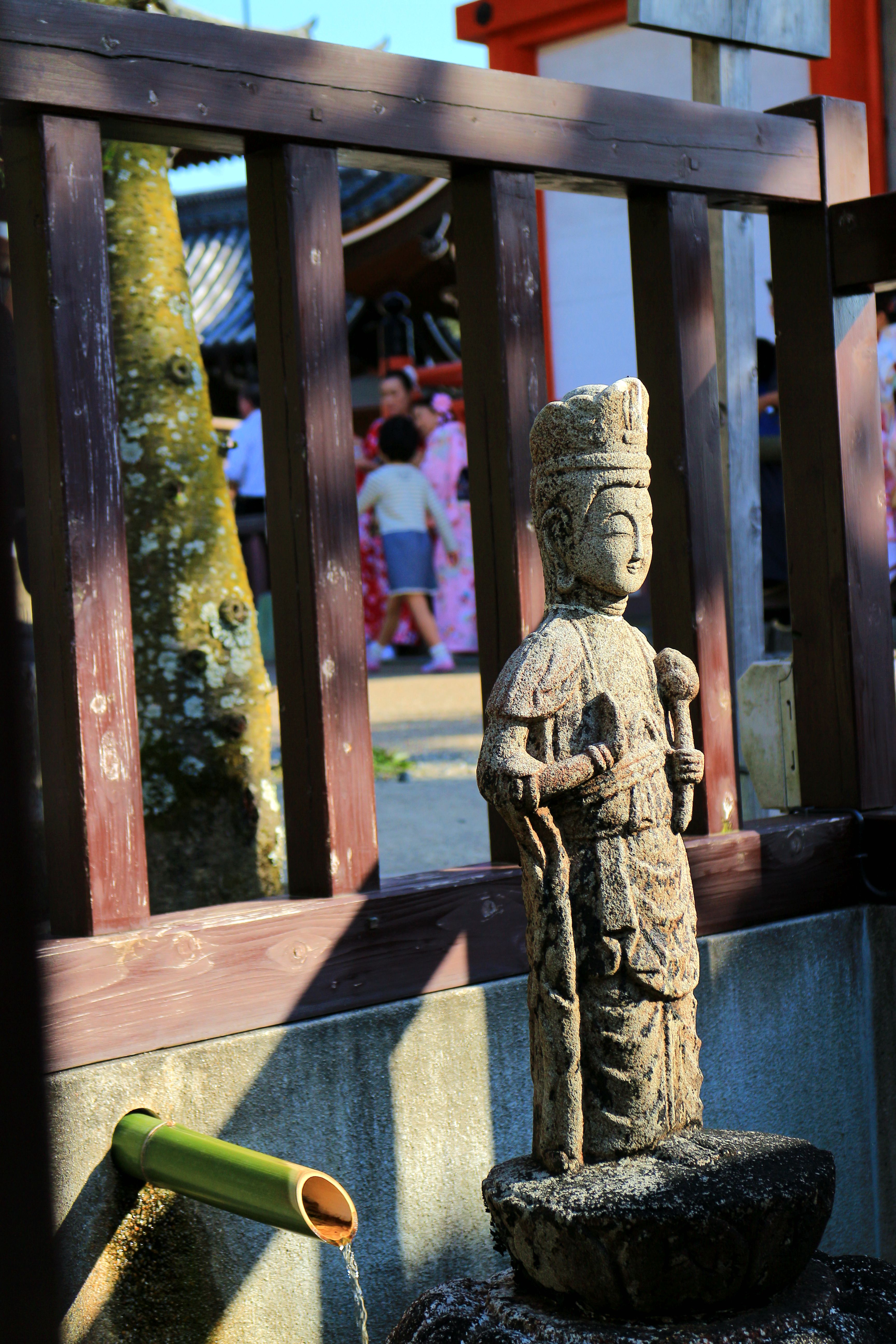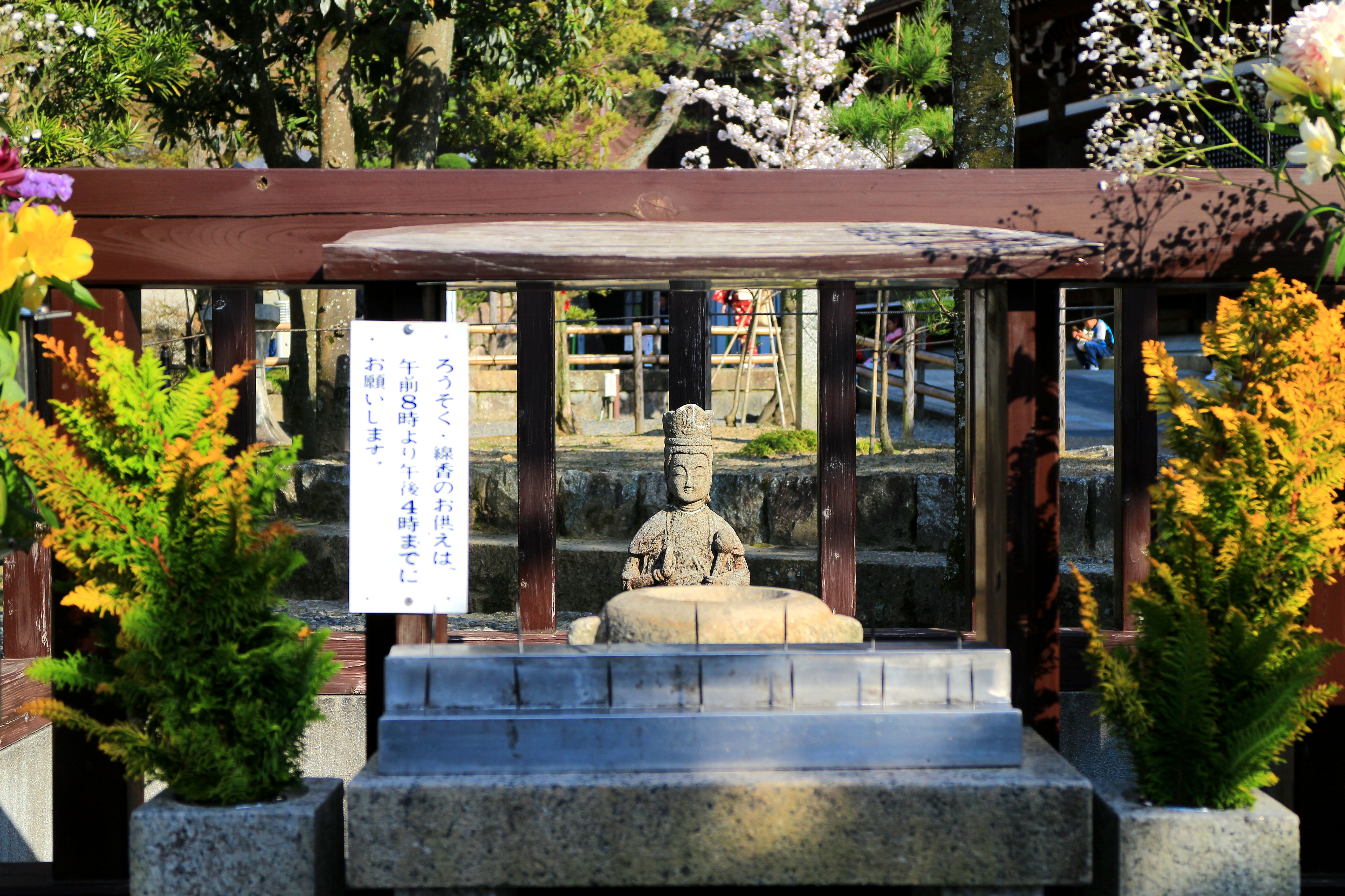 最後在三重塔一旁看見一個清幽的庭園,一旁有個小池子的石橋,一旁還有個圍起來的小許願池,裡面有座小石觀音,金黃的下午暖陽灑落在這觀音上,讓祂的神情更加祥和~