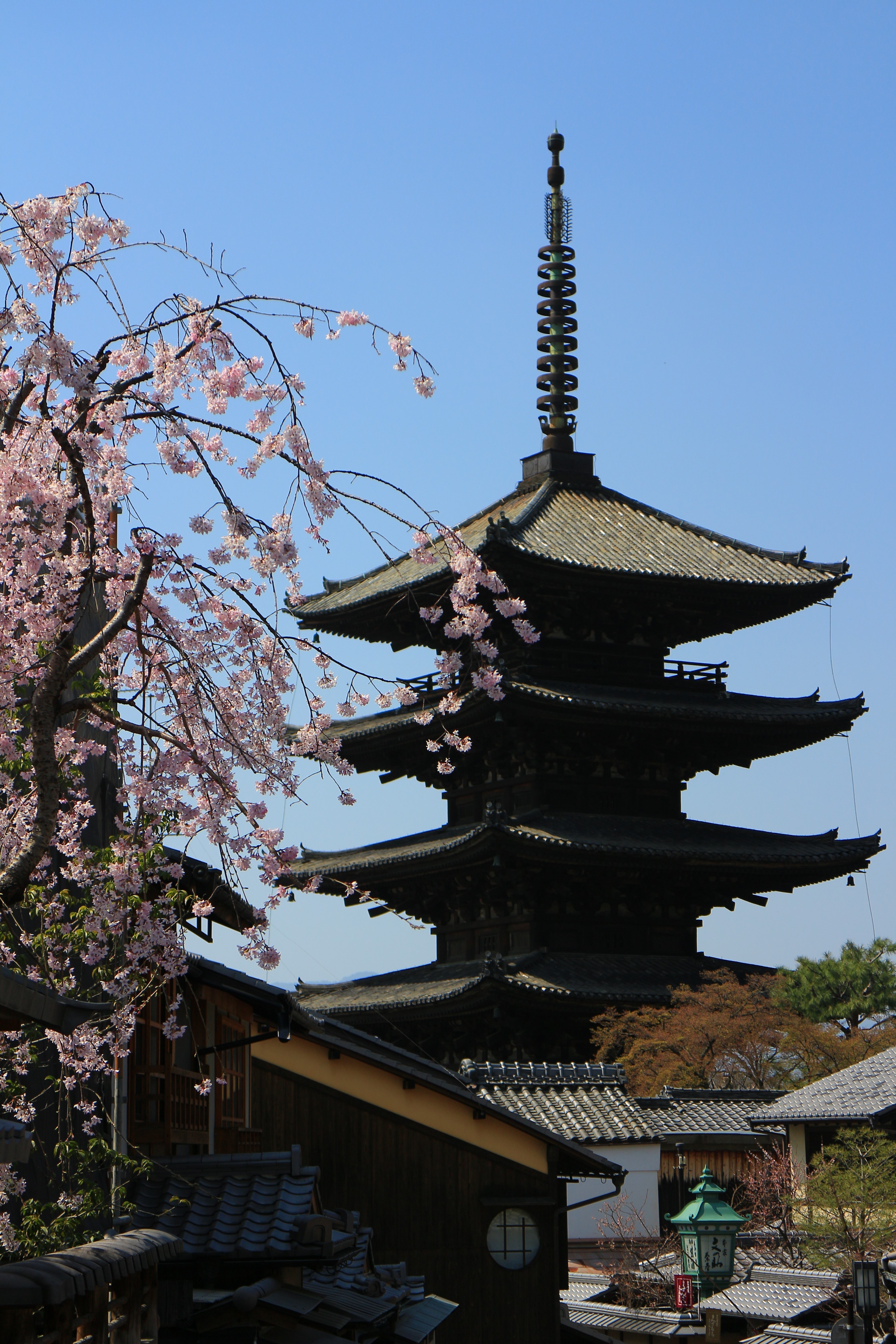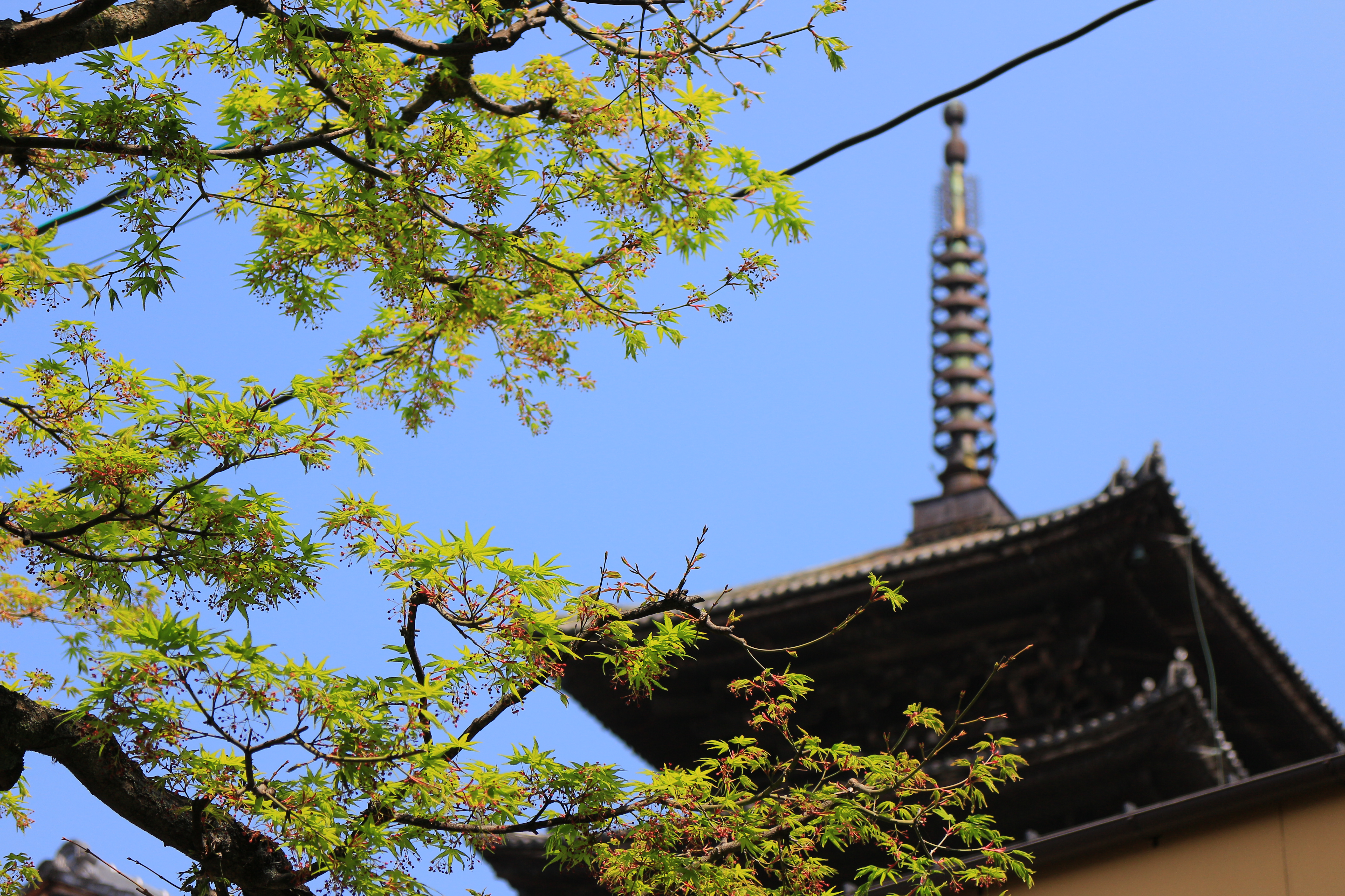 就在室友沉浸在櫻花妹的圍繞中,我就來順道拍拍幾張正處在粉色櫻與綠楓葉中的五重塔照片吧!