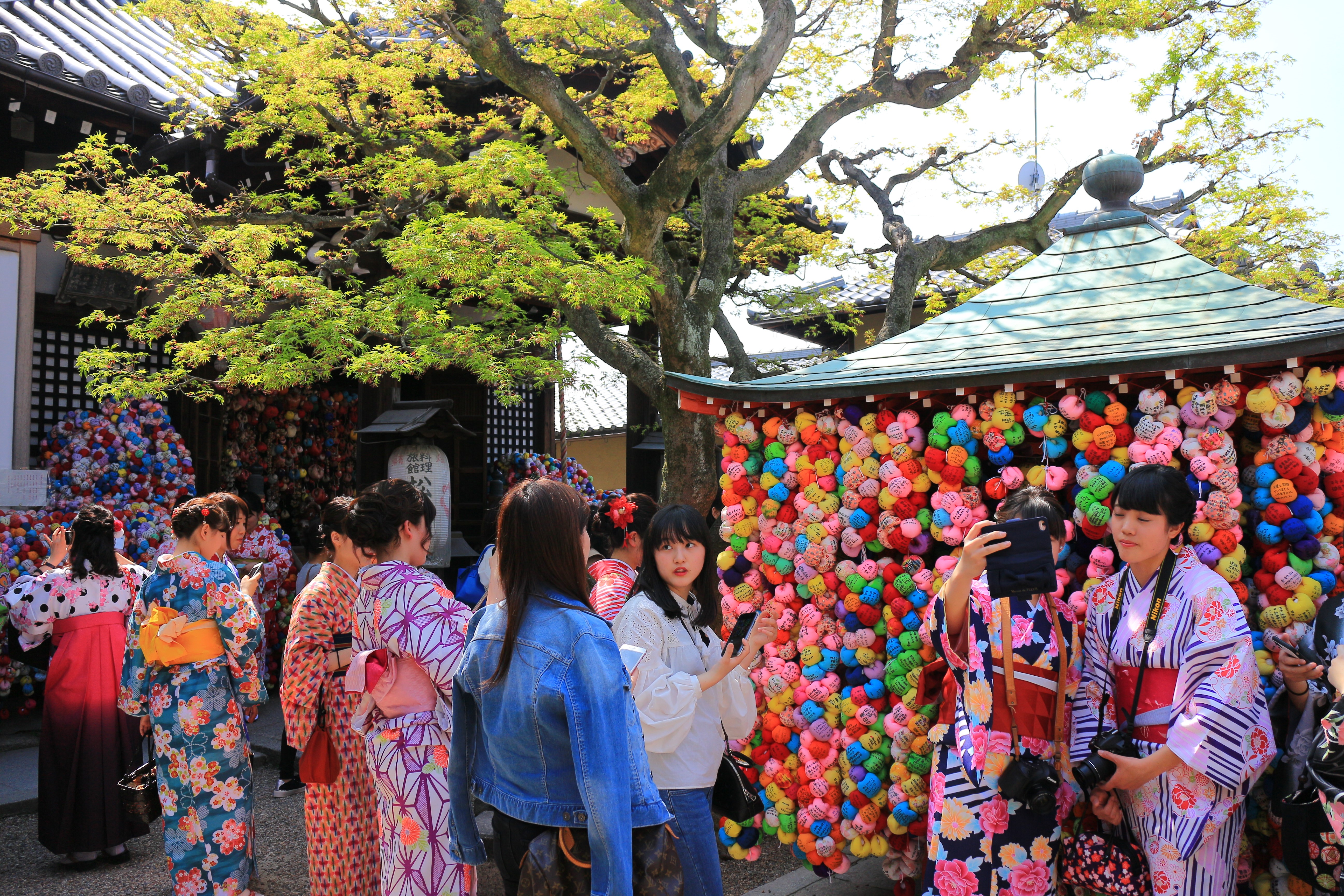 這間深藏在路上的小寺廟叫做大黑山金剛寺(八坂庚申堂),而掛在正殿前那五彩繽紛的球狀體其實是可愛猴子布偶,根據我後續上網查詢,每一隻猴子都是手工製,一隻是500日元,其功能就如同其他神社的繪馬一樣,猴子的造型是手腳綁在一起的模樣,意為克制慾望,但是因為猿又與緣同音,所以也有結緣的意思。