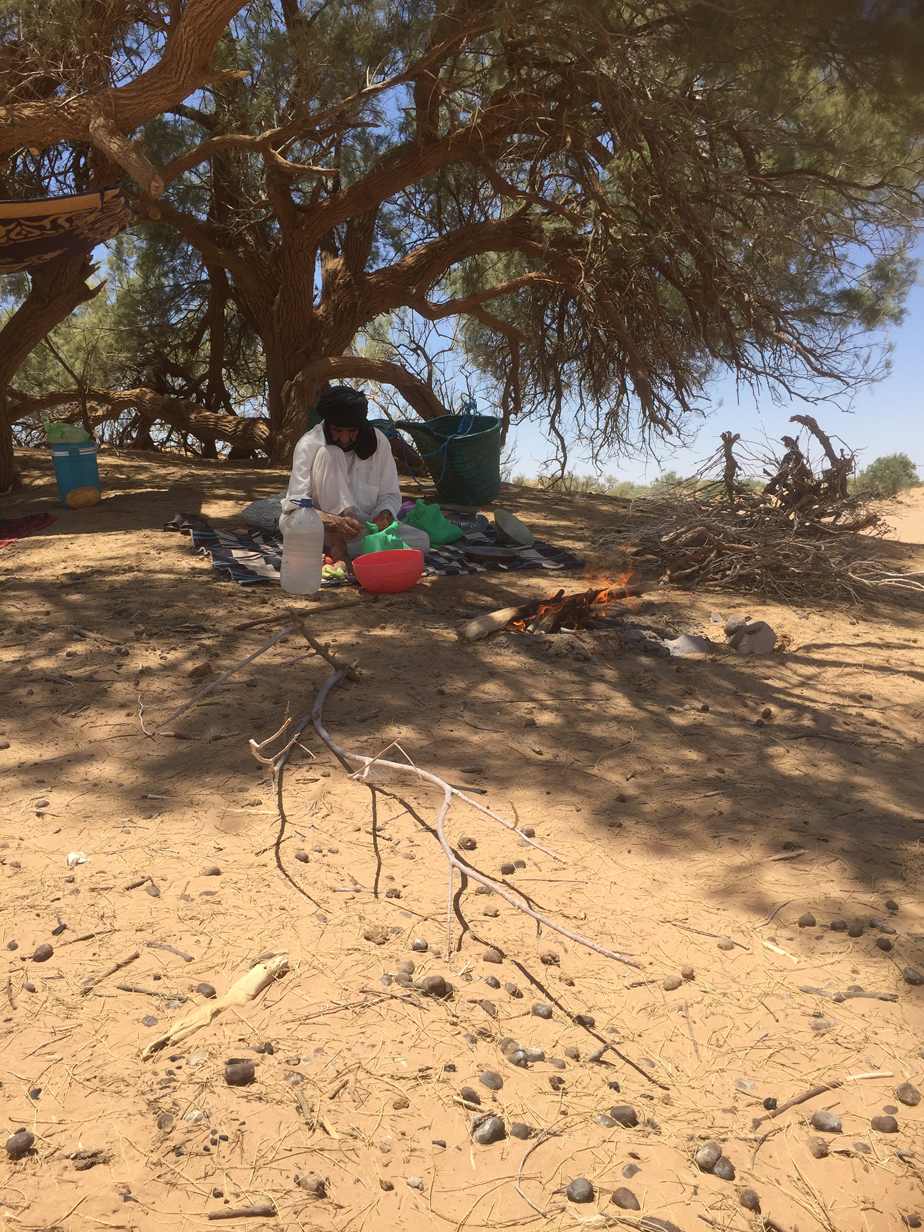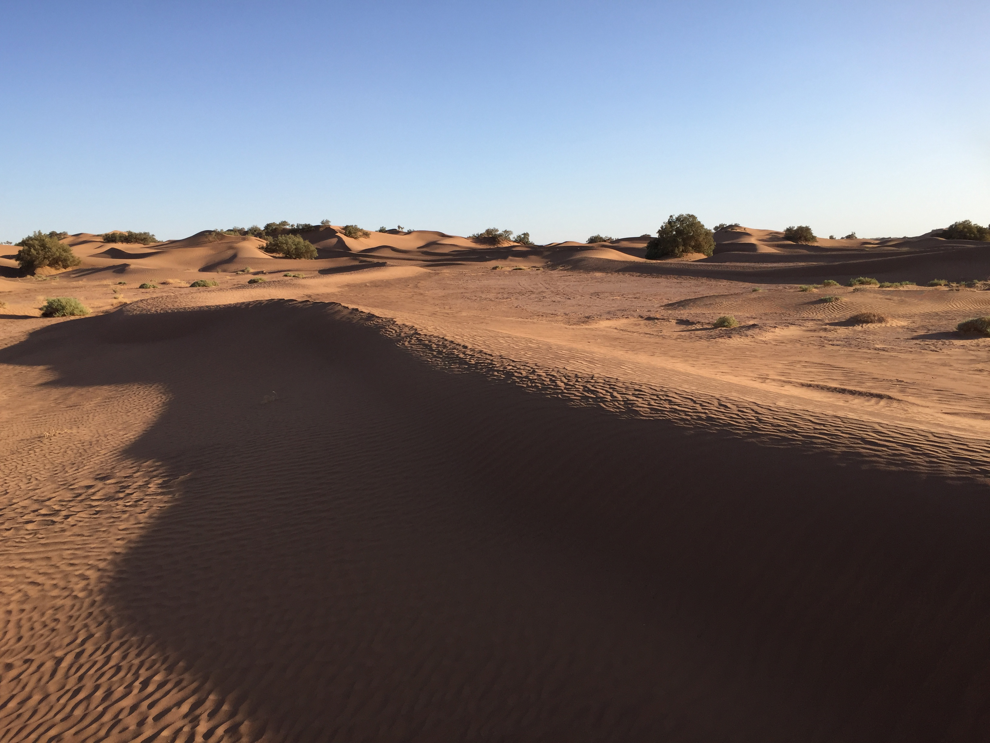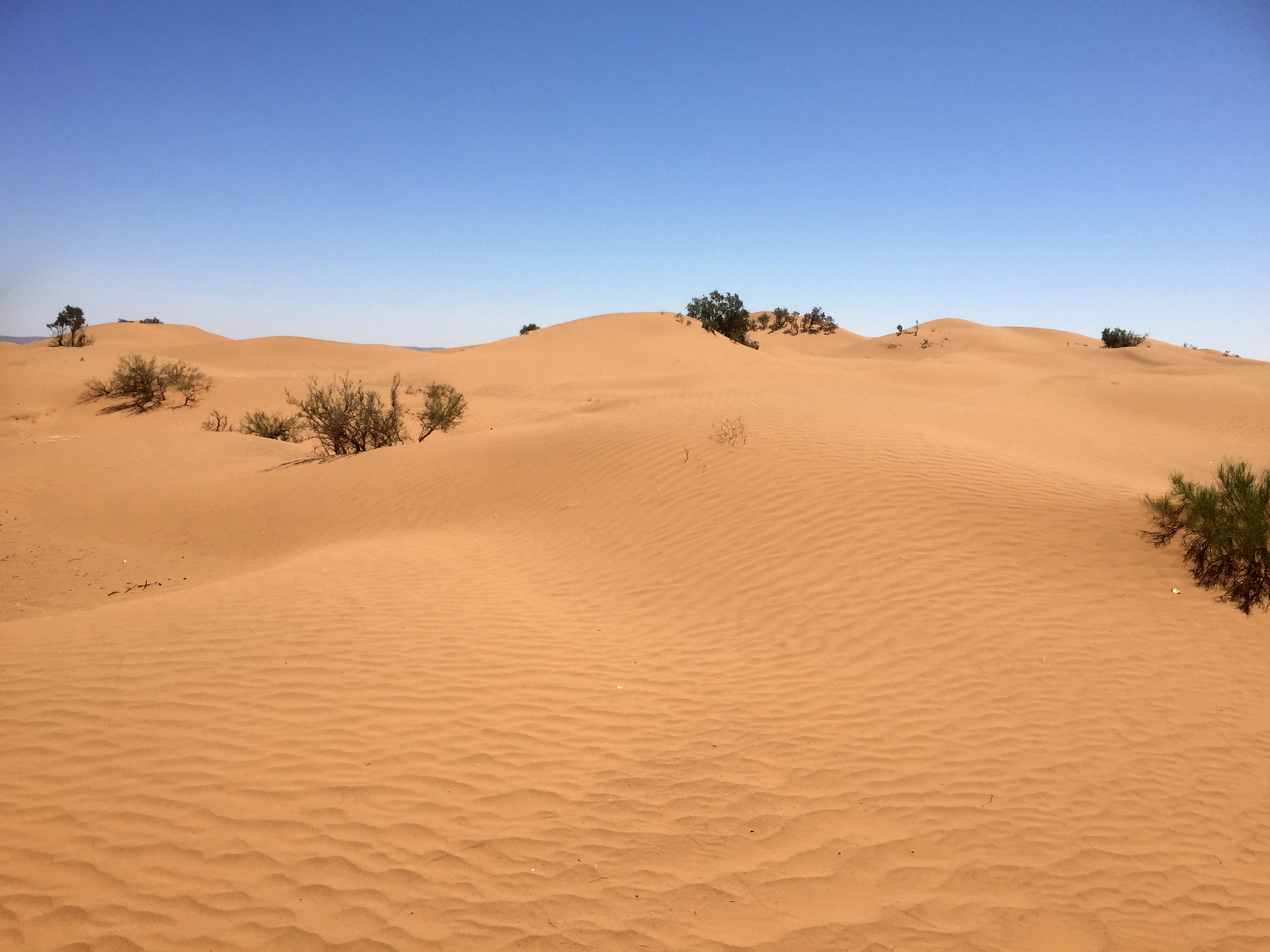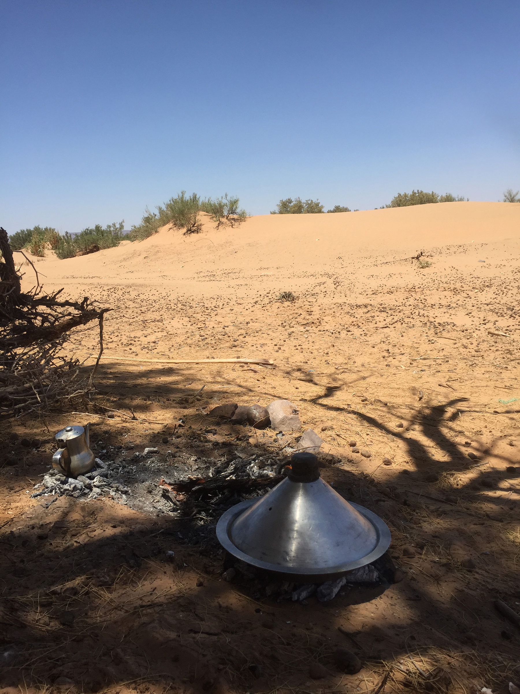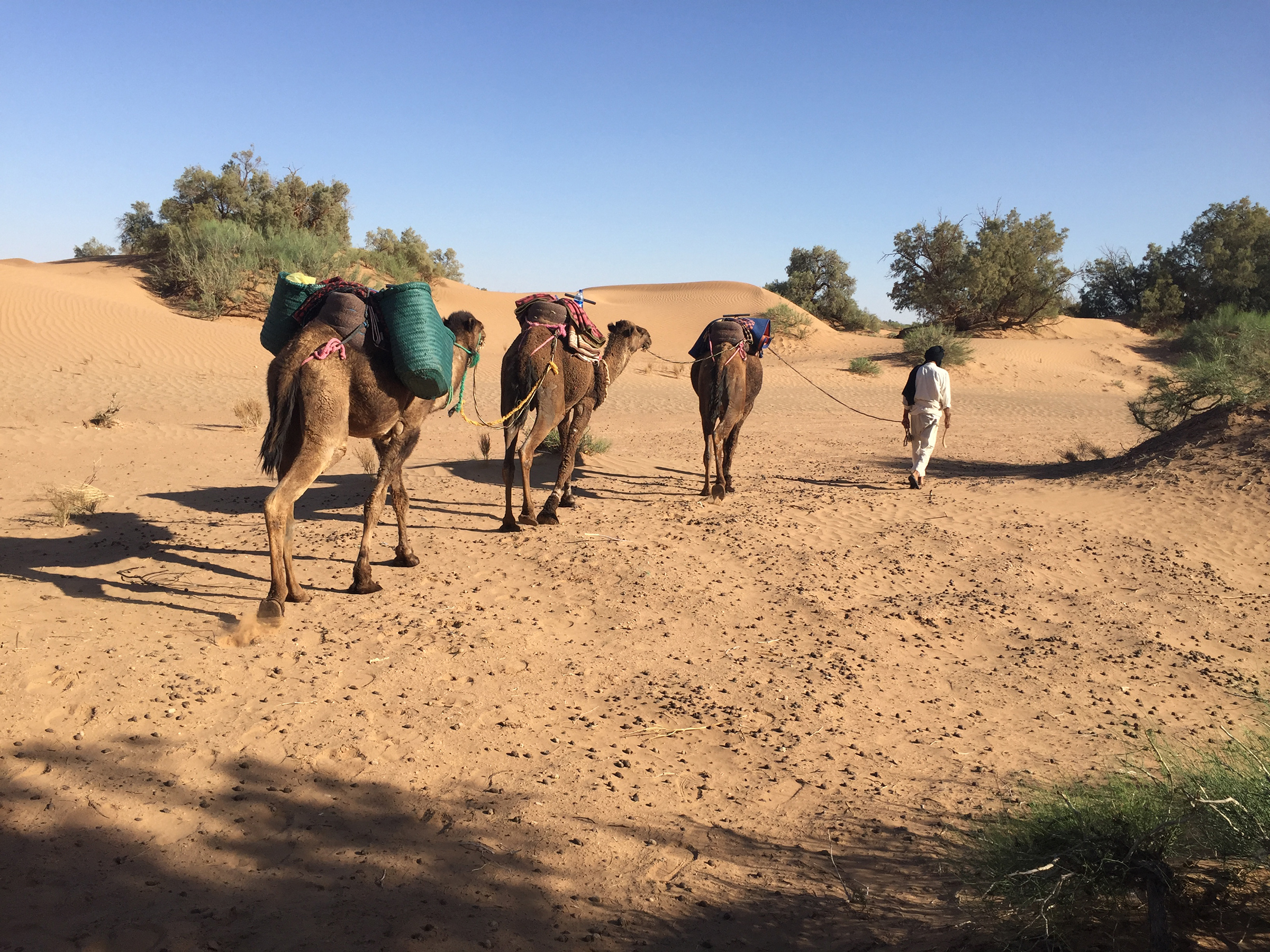 After a day of relaxation in the desert camp we did a camel daytrip into the desert. Its very very hot but a very impressive trip. It took hours to walk in the desert before we arrived at a small oase where we had tajine barbecue. In the silence of the desert you can hear the wind "sing" in the dunes.