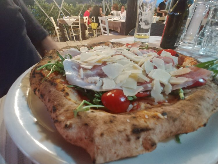 Nowadays we need to refer to this style pizza as Napoletana style pizza. It has a chewy, soft yet crisp base, has fresh tomato sauce and buffalo mozzarella. It is truly sublime. The first pizza is a Margherita and the second one is prosciutto, rocket and Parmesan.