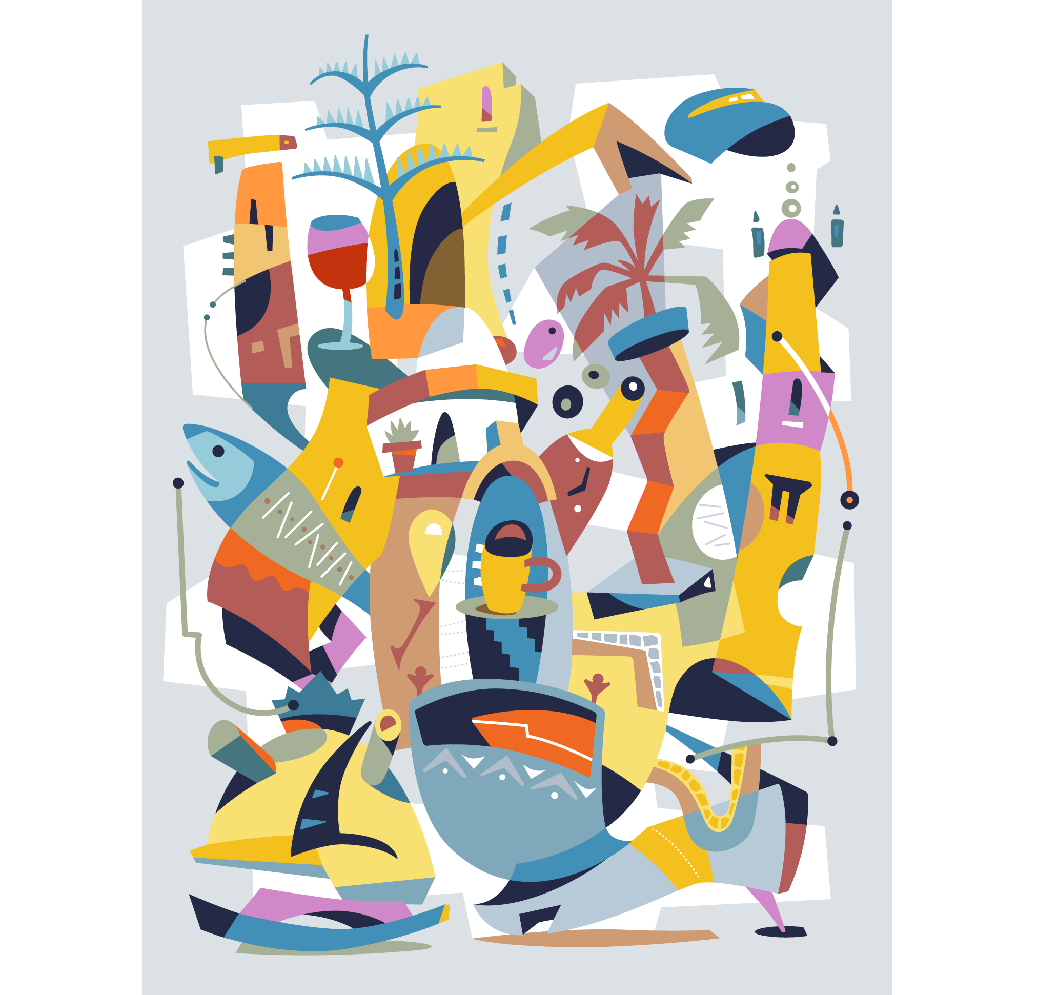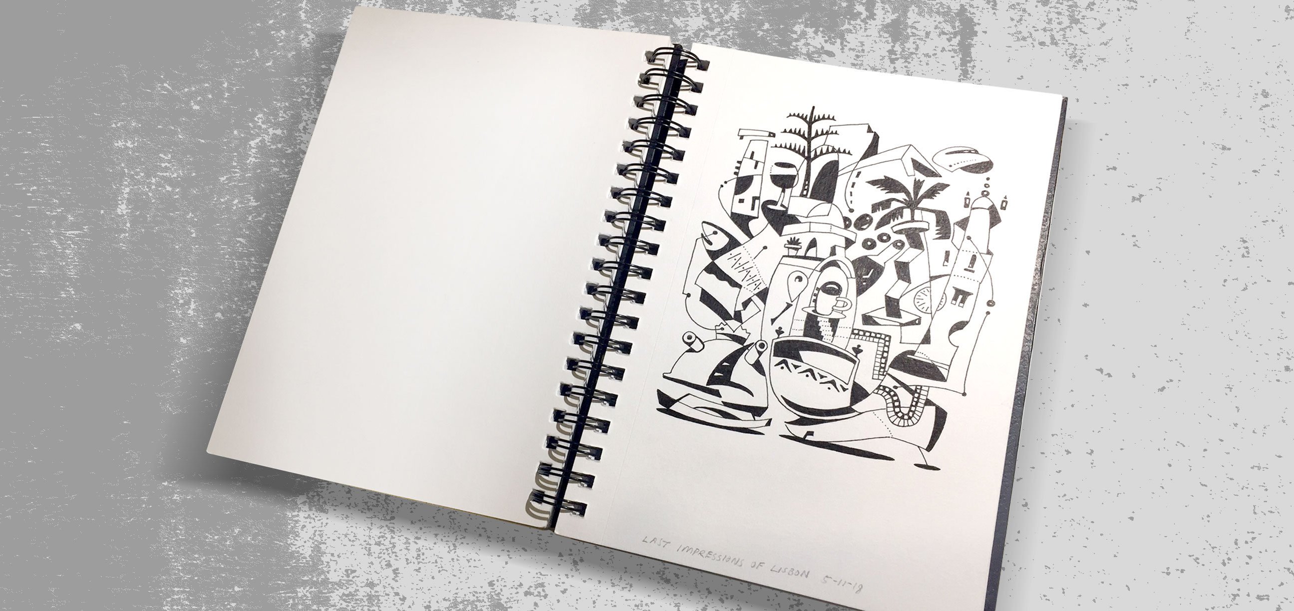 The last night in Portugal as we were repacking and organizing our things for a morning flight back to Copenhagen and ultimately Seattle, I was looking through the 20-some sketches I had done on the trip. So many cool places – old towns, castles, megalithic stones, wine country, cruising on the Duoro River, getting stuck on narrow roads, finding amazing food at little out of the way places. This exploration around Portugal was so great. I wanted to do one more drawing, but what? After dark in the hotel room… So I just began lightly penciling in shapes from memory at random, just for fun. That turned into the sketch below. Later I scanned it and drew it in my vector program, giving it form and color. I do plan to paint it on canvas as well, but have not started that yet.