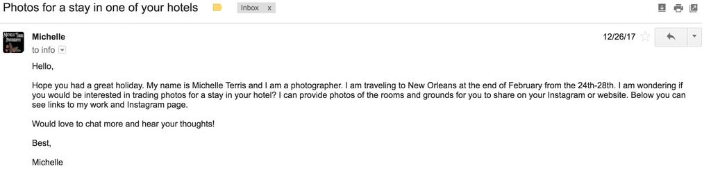 Today I want to share some tips on how I’m learning to travel for free, or on the cheap side. I’m headed to New Orleans at the end of February and started reaching out to hotels who I thought might be interested in some photos for their Instagram or website. Below I’m attaching the email I sent for you to see how easy it is.