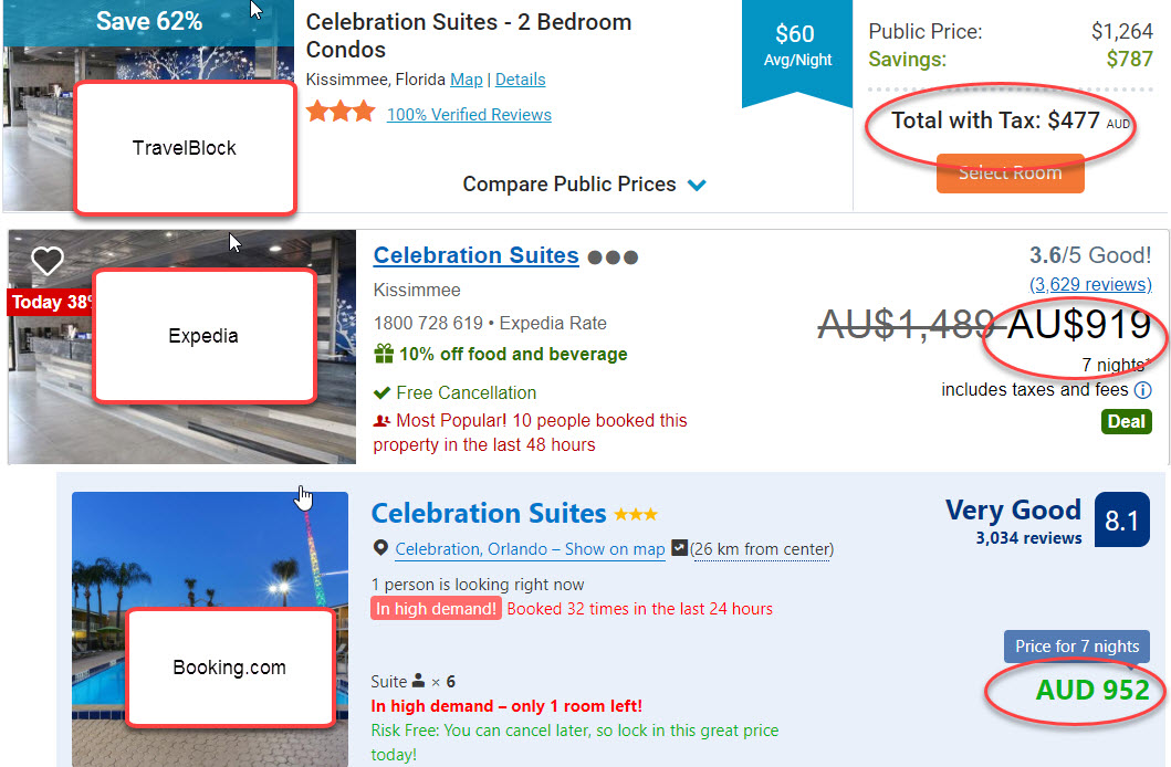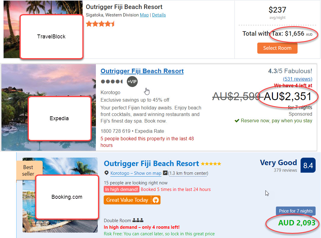 In this article will demonstrate how much cheaper TravelBlock prices are when compared to 2 major online travel agents: Expedia and Booking.com. The comparative prices are based on 2 adults staying at the same hotel for the same duration.