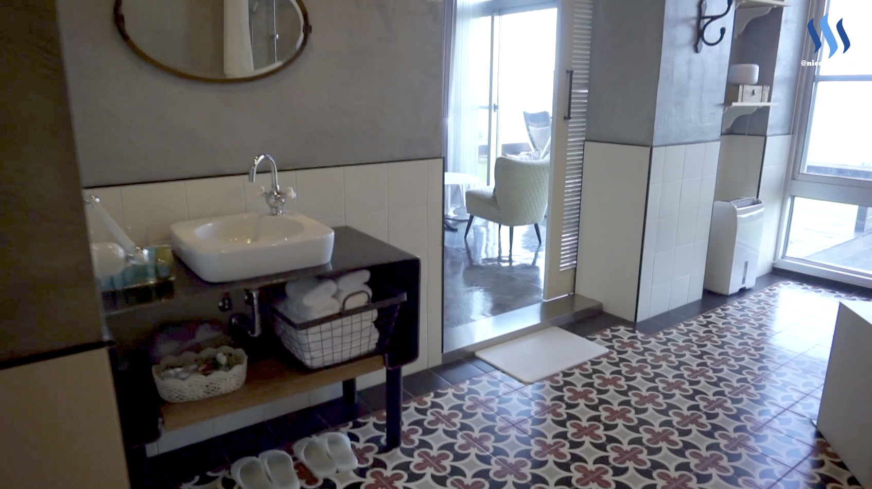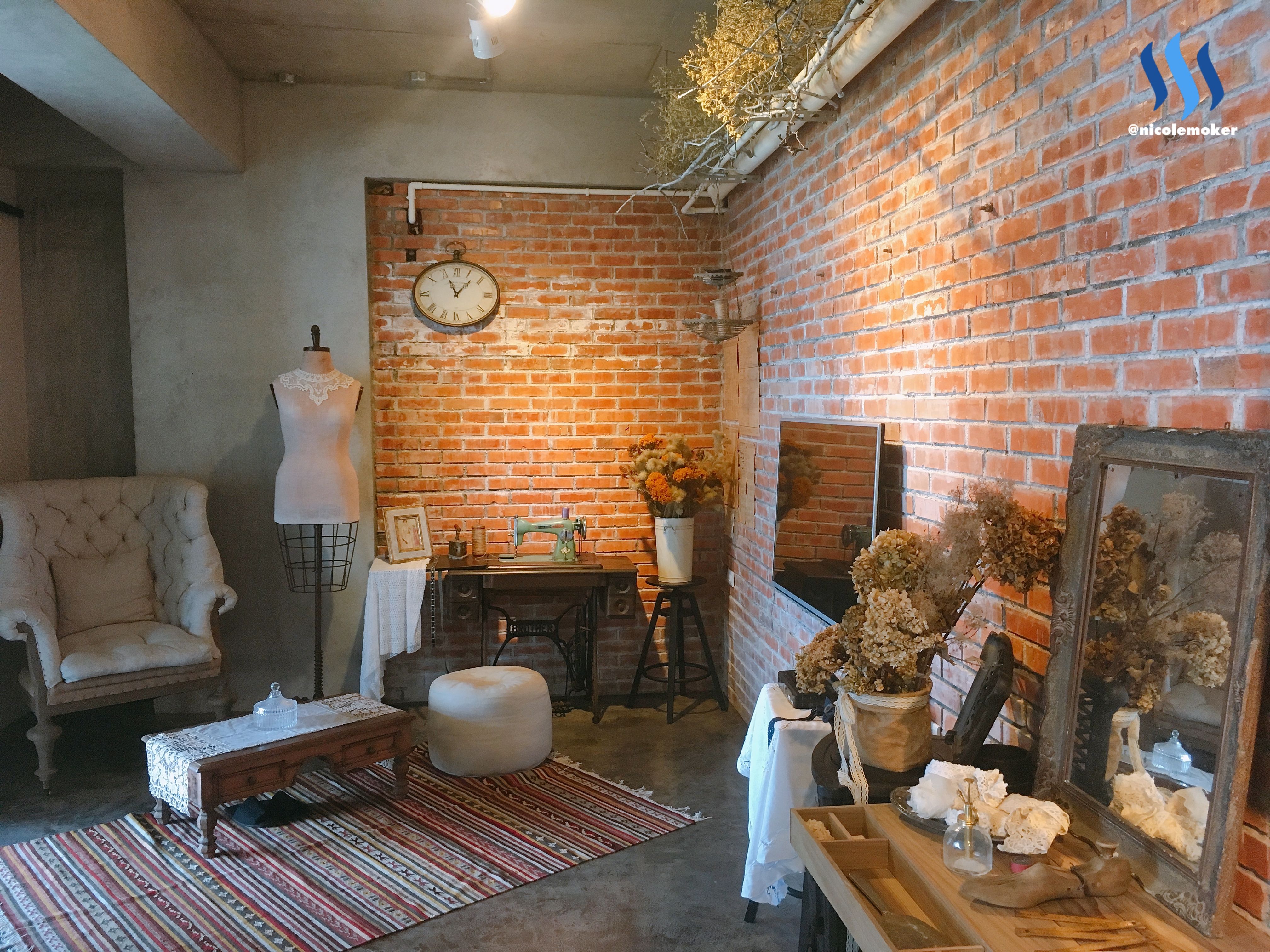 Tailor room is divided into 3 areas, the bedroom, the living room and the bathroom. The room is artistic and decorated with lots of lace, dried flowers and floral tiles. The design is pure and girly, colours mainly used with white, pink and light grey.
