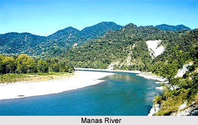 According to local stories, the name of the park is generated from the Manas River, flowing North to South West dividing the park into two parts, which is named after the Goddess Ma Manasa, daughter of lord Siva. The river passes through the park and splits into three rivers as it reaches the plains viz. Naljhara, Beki and Ultaikhunda.The Naljhara and Beki river later on join together near Barpeta Road and called as Beki River. On the other side the third part of Manas River flows toward South-West side via Kamargaon, Burikhamar, Bhulokadoba (There are some page which have the wrong data that Manas River is divided into two parts, Beki and Bhulukadoba). Beki River is a major water source of Mighty Bramhaputra. The Manas River also serves as an international border dividing India and Bhutan. The bedrock of the savanna area in the north of the park is made up of limestone and sandstone, whereas the grasslands in the south of the park stand on deep deposits of fine alluvium. The combination of Sub-Himalayan Bhabar Terai formation along with the riverine succession continuing up to Sub-Himalayan mountain forest make it one of the richest areas of biodiversity in the world. Manas National Park occupies an area of 500 sq. km and it is located at the foothills of the Bhutan Himalayas in Baksa and Chirang districts of Assam in between 26°35'-26°50'N latitude and 90°45'-91°15'E longitude. The National Park consists of three ranges namely -the Western Range with its headquarters at Panbari, the Central Range with Bansbari as its headquarters near Barpeta Road, and the Eastern Range with Bhuyapara near Pathsala as its headquarters .Out of the three ranges, two ranges namely Bansbari and Bhuyapar are under the Baksa district with an area of 394 sq. km. and the Panbari Range (106 sq.km.) is under the Chirang district.