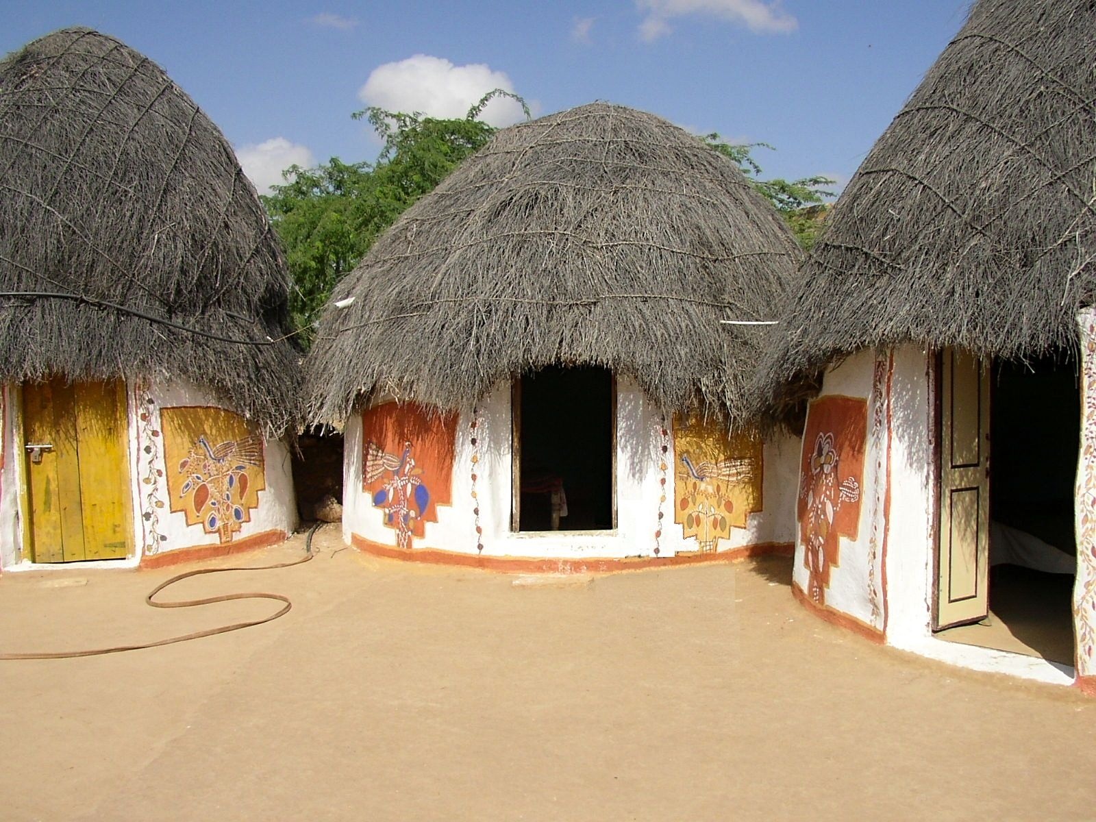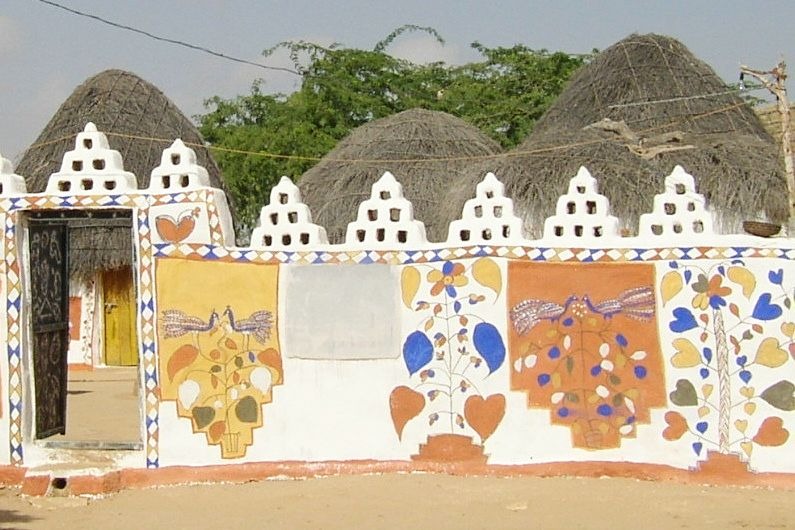 Arriving at the village I was surprised by the simplicity of the traditional-style huts, the beautiful paintings decorating the clay walls, the thatched roofs, and the very clean and well-kept courtyards. Sandy and dusty streets under the hot sun, but in one another space, beautiful trees and shrubs provide good shade. We walked through the village and there were very few people outside. It felt a very calm, pleasant and safe environment.