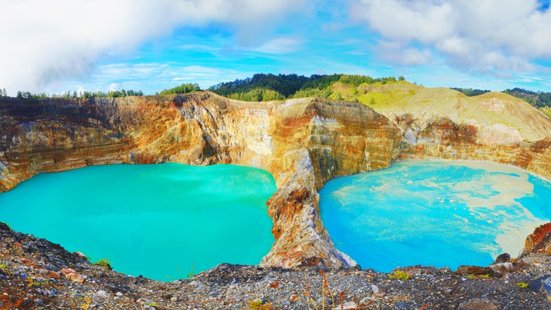 ***Lake Kelimutu is located on Flores Island, NTT Province, Indonesia. The location of this mountain precisely in the Village Pemo, District Kelimutu, Ende District.Lake Kelimutu is famous for its three colors, red lake, blue and white, Lake Tiga Kelimutu has a different name with its color. The three lakes are named Tiwi Ata Mbupu, Tiwu Nuwa Muri Koo Fai and Tiwu Ata Polo. The most extensive lake, Tiwu Nuwa Muri Koo Fai has an area of about 5.5 hectares with a typical green color of moss. Lake Tiwu Ata Mbupu has 4.5 hectares of green. While the lake Tiwu Ata Polo only 4 hectares the smallest of the other two