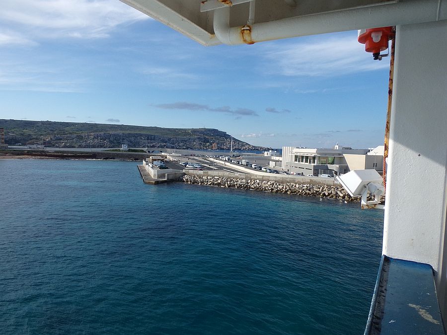 On the ferry looking back at the harbor in Cirkewwa which is main Malta's most Northern port.