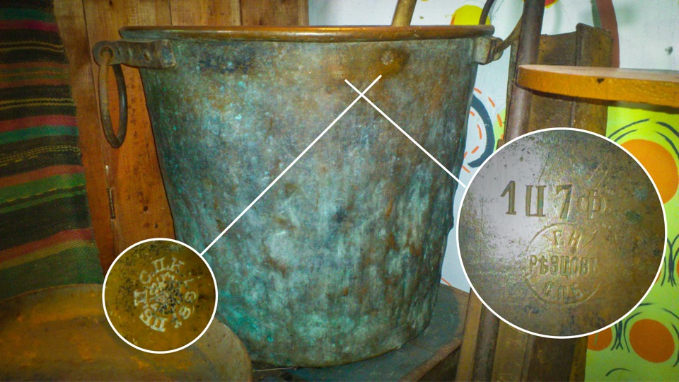 A huge copper vat, in which soups were cooked for the whole big family. Made in times of Catherine II in St. Petersburg. In those times same vats was very rare, because low tecnology of those times. Hard to made. It was weeeery expensive.