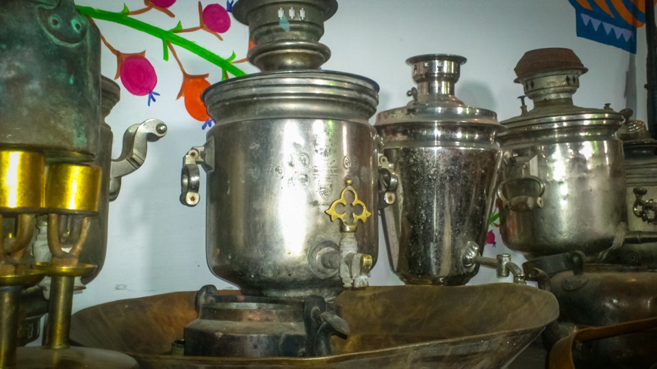 Royal samovar (it's device for boiling water, for tea). Like a kettle. It works on wood. Inside of it small wood burning stove. It 300 years old. But we still use it, when on the rest at nature. Not everybody. Just some.