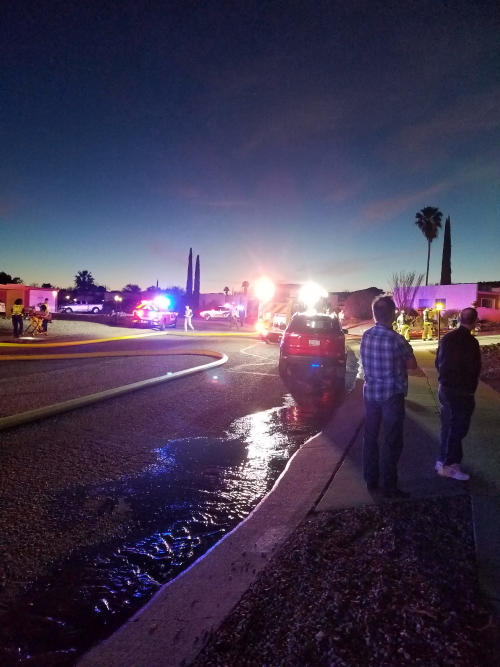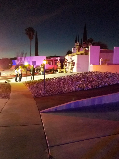 I had only been at my destination two hours on Saturday afternoon when the excitement began! Walking back from the community hot tub, we smelled smoke, and then saw a big plume of it over the nearby buildings. Ms. R. and her significant other, Mr. S., became concerned that it might be coming from their house. It turned out to be three doors down, at the opposite end of their 4-unit townhome. A neighbor was just calling the fire department. Three police cars and two support vehicles arrived before the fire trucks, but soon they were dousing the fire. By the time we had retrieved our phones from inside the house, the worst of the flames had already died down. The lights in the photo are from the emergency vehicles.