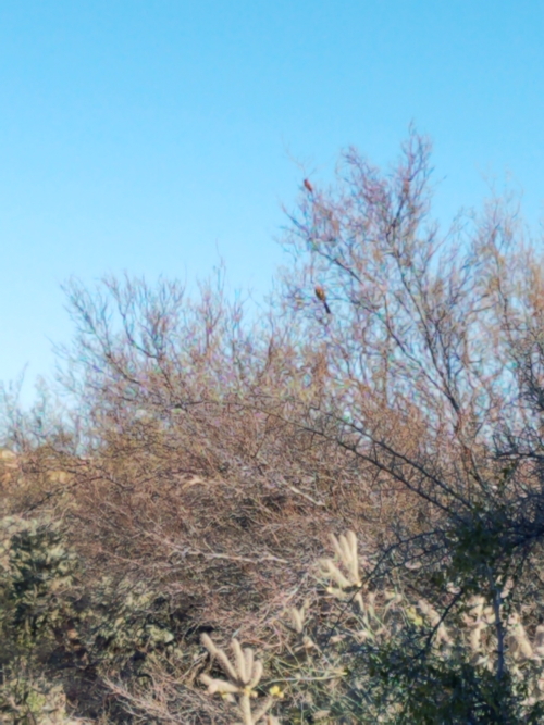 We used to see cardinals when we lived in Minnesota, so I was pleased to discover them here, too. But they are quite uncooperative when it comes to getting their picture taken. There is one near the top of this tree, 'way off in the distance, and even with the zoom it can barely be seen. Just as I snapped the photo, another bird flew up and perched below the cardinal. I'm still trying to identify that one.