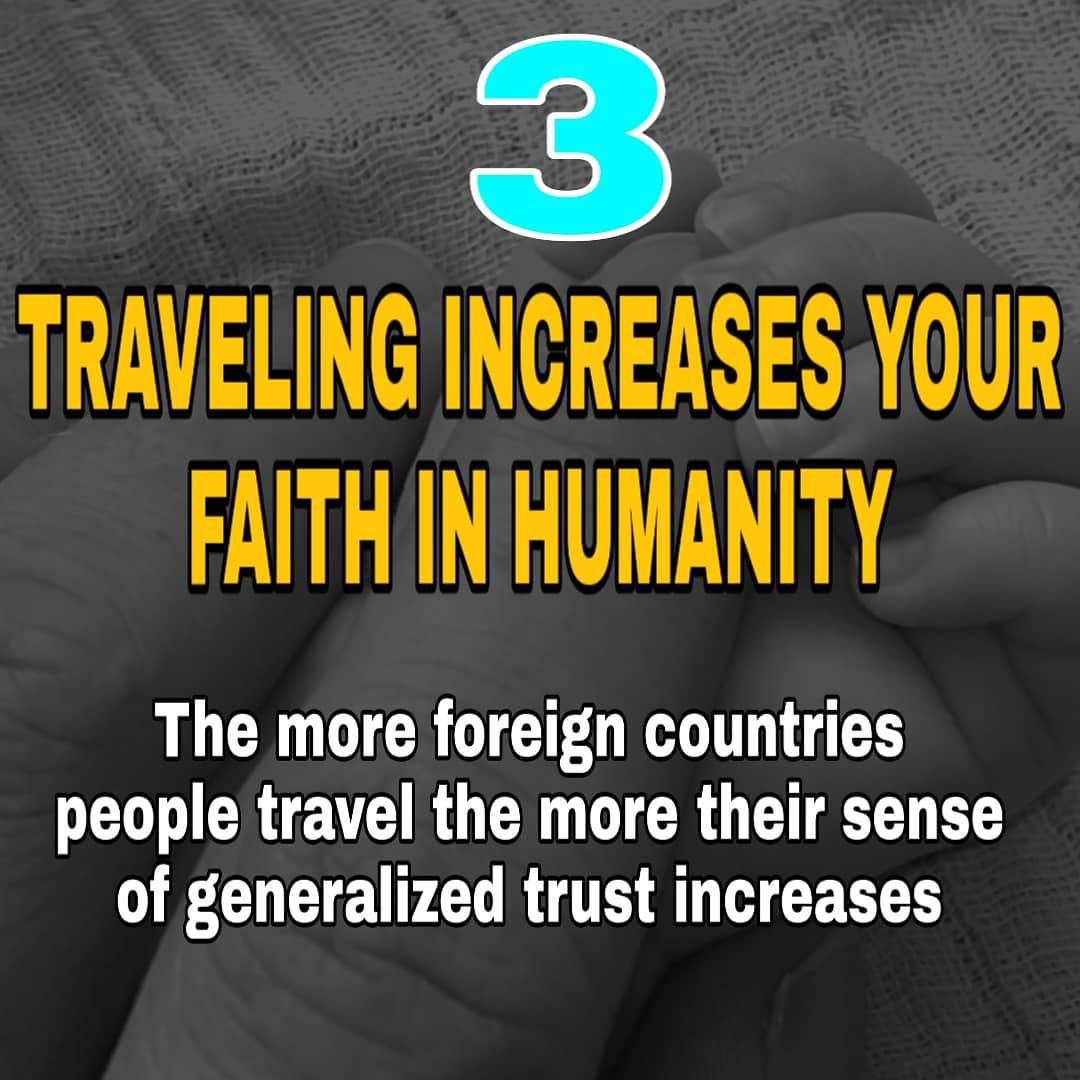 The more foreign countries people people travel to the more their sense of generalized trust increases. Seeing all of the good that exists in the world, makes easier to trust and the most people to the most part are just trying to do the right thing.