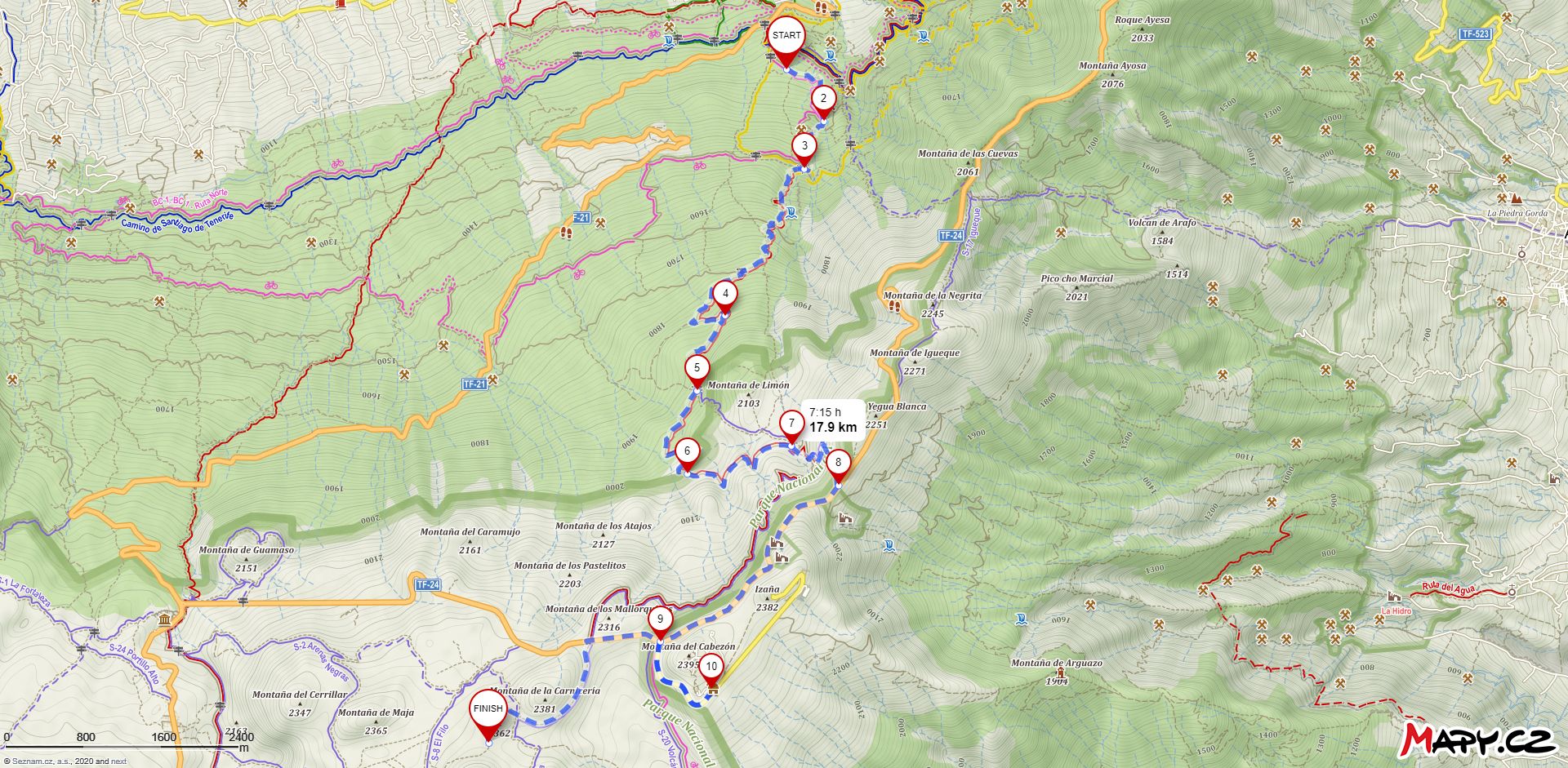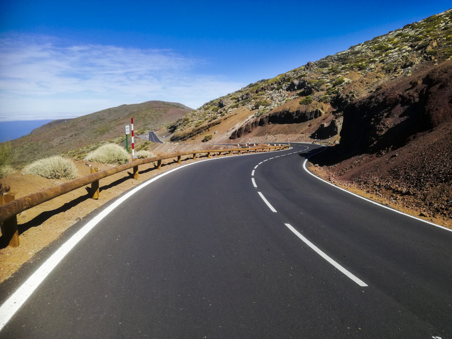 The temperature was very pleasant for the march, estimated at about 15 degrees Celsius. Even in the alpine semi-desert we were in. We left the hiking trail for cars at an altitude of 2150 meters and set out on the S-21 to the road. After which we continued to the Observatorio Astronomico Teide. On the road we usually met only cyclists and at one moment a luxury car from the first half of the 20th century passed by.
