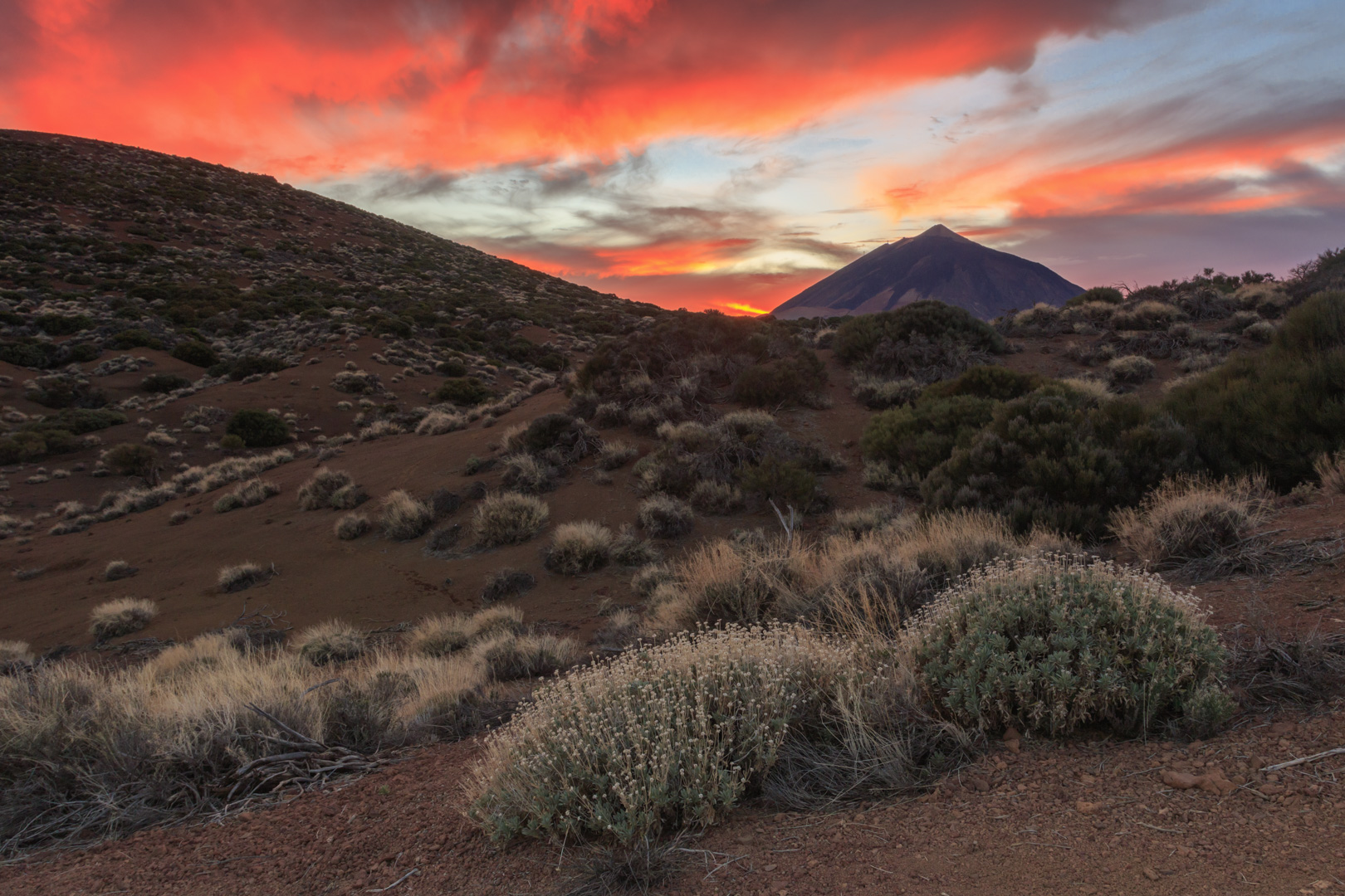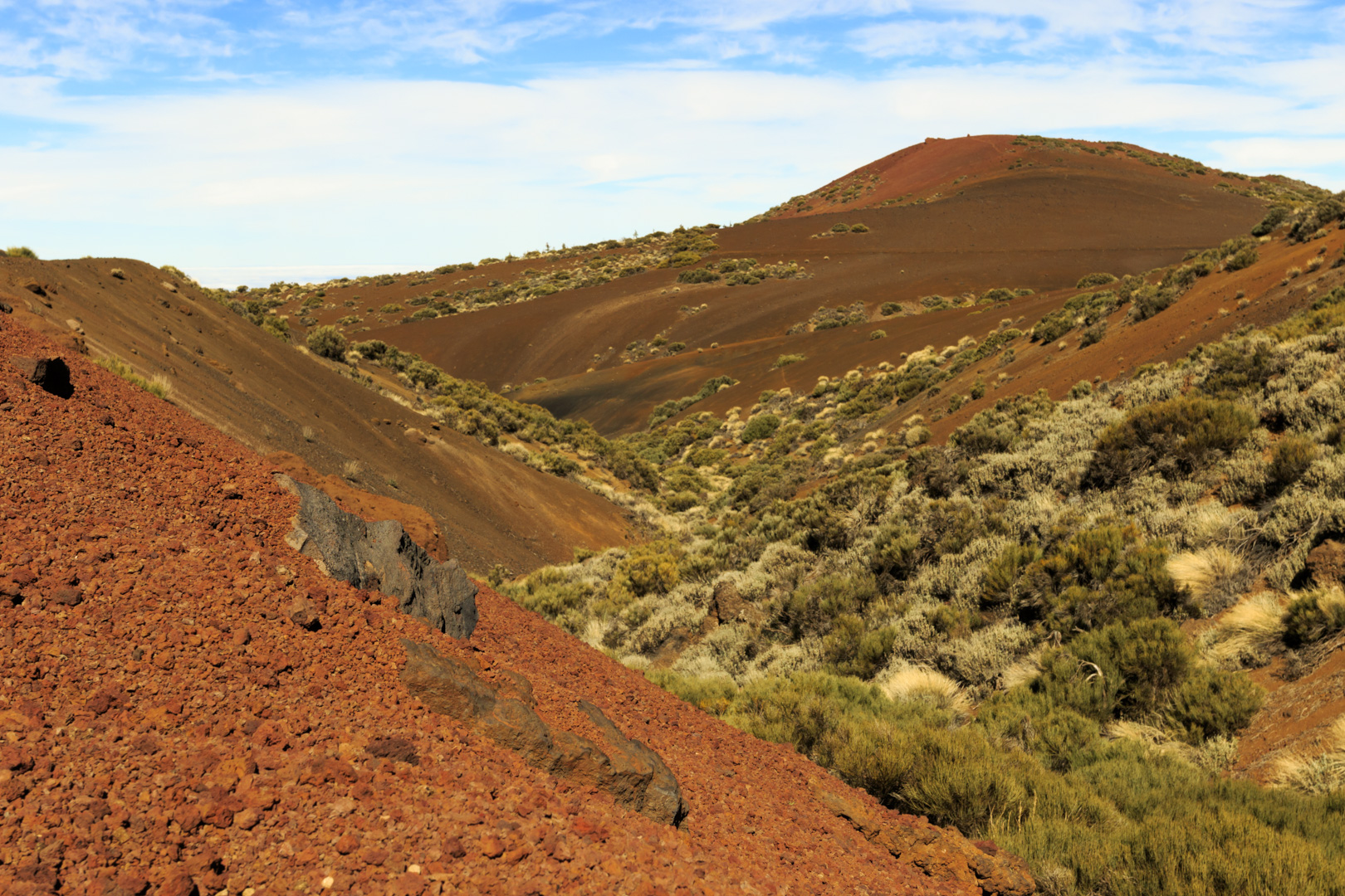 Teplota byla na pochod velmi příjemná, odhadem kolem 15 stupňů celsia. Dokonce i ve vysokohorské polopoušti ve které jsme se nacházeli. Turistickou stezku pro auta jsme opustili ve výšce 2150 metrů a vydali jsme se po stezce S-21 k silnici. Po které jsme pokračovali k Observatorio Astronomico Teide. Na silnici jsme většinou potkávali pouze cyklisty a v jednu chvíli kolem nás projel luxusní automobil z první poloviny 20. století.
