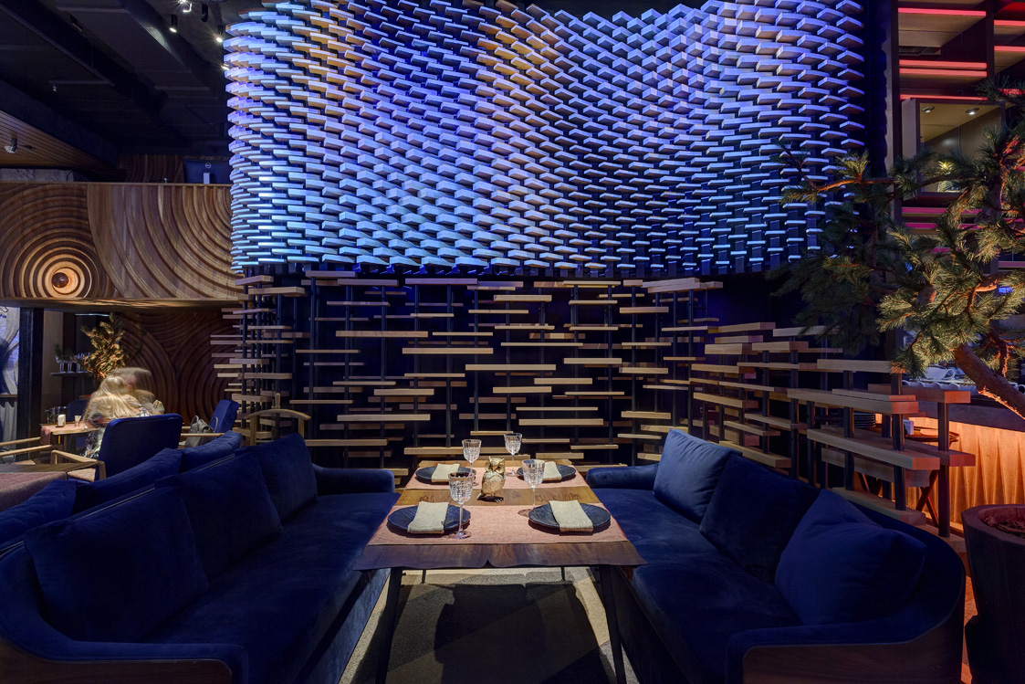 Asian restaurant and bar Insight attracts everyone not just because of the view but also because of quite peculiar interior design. Finishing, furniture and decor elements bring direct associations with Russian nature. Columns of translucent concrete "come to life", forest flowers in bloom, or jellyfish swimming, like in the Arctic ocean. With the help of tricky 3D-mapping technology, the interior turns into a colour collage, supplemented with constantly changing audio, visuals and even smells and flavours!
