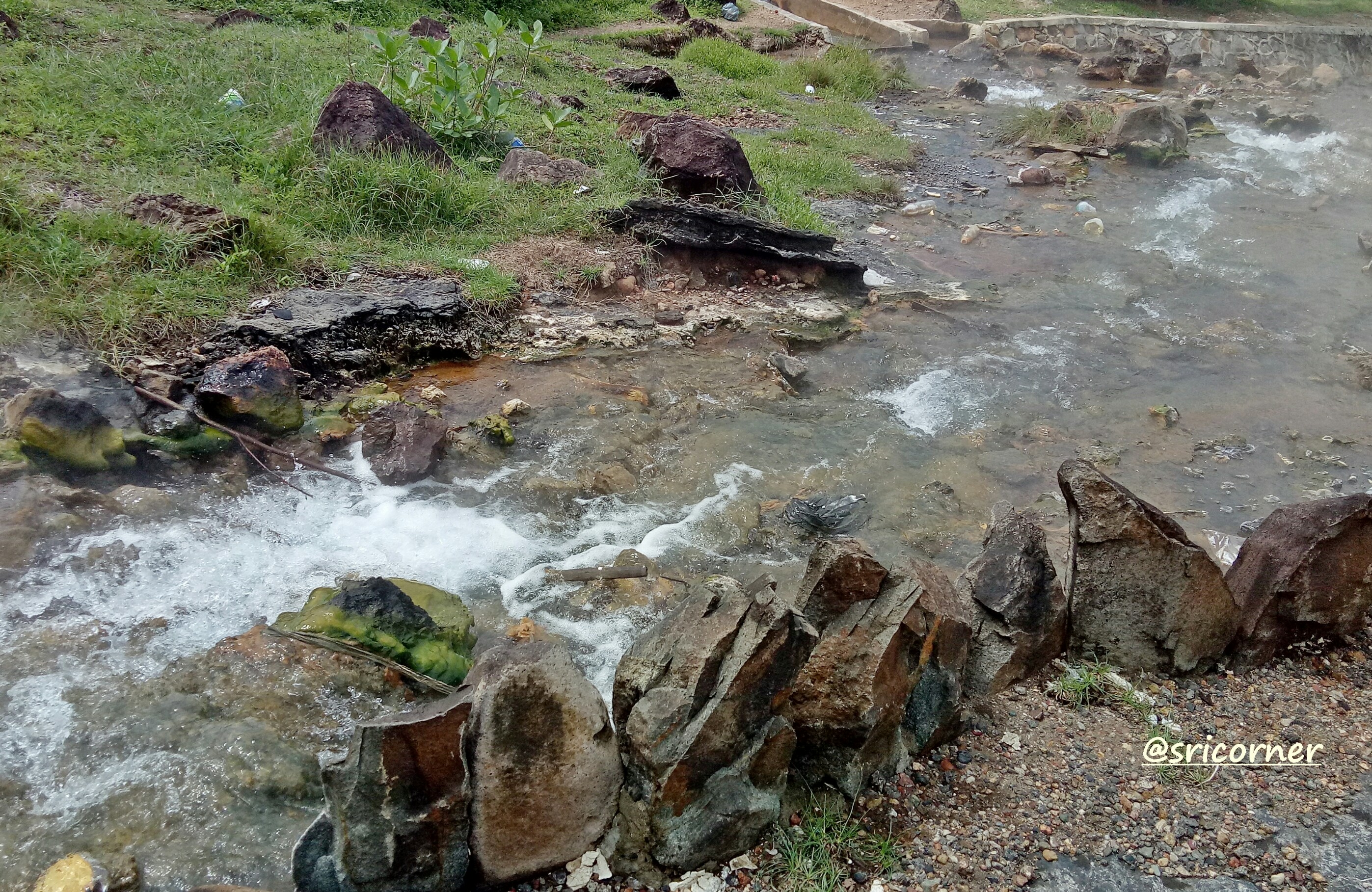 Hot water flows from the foot of the mountain. Standing close next to it makes you feel the heat.