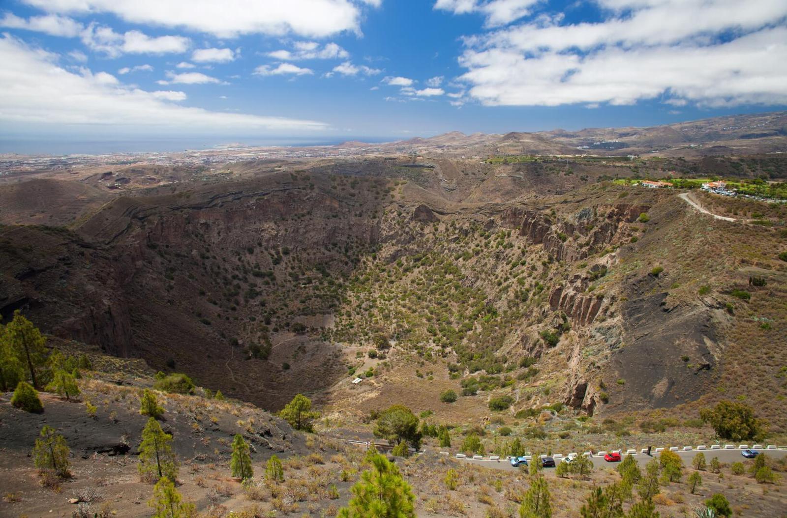 La Caldera de Bandama está situada en el noreste de la isla de Gran Canaria. Forma parte del monumento natural de Bandama. Tras una serpenteante carretera de 6 kilómetros en los que recorrerás viñedos y un paisaje volcánico sin igual, llegarás a este singular lugar. El nombre debe su origen al holandés Daniel Van Dame, quien cultivó viñedos en el cráter. Si te animas, podrás bajar en 30 minutos hasta el cráter a través de unos senderos.