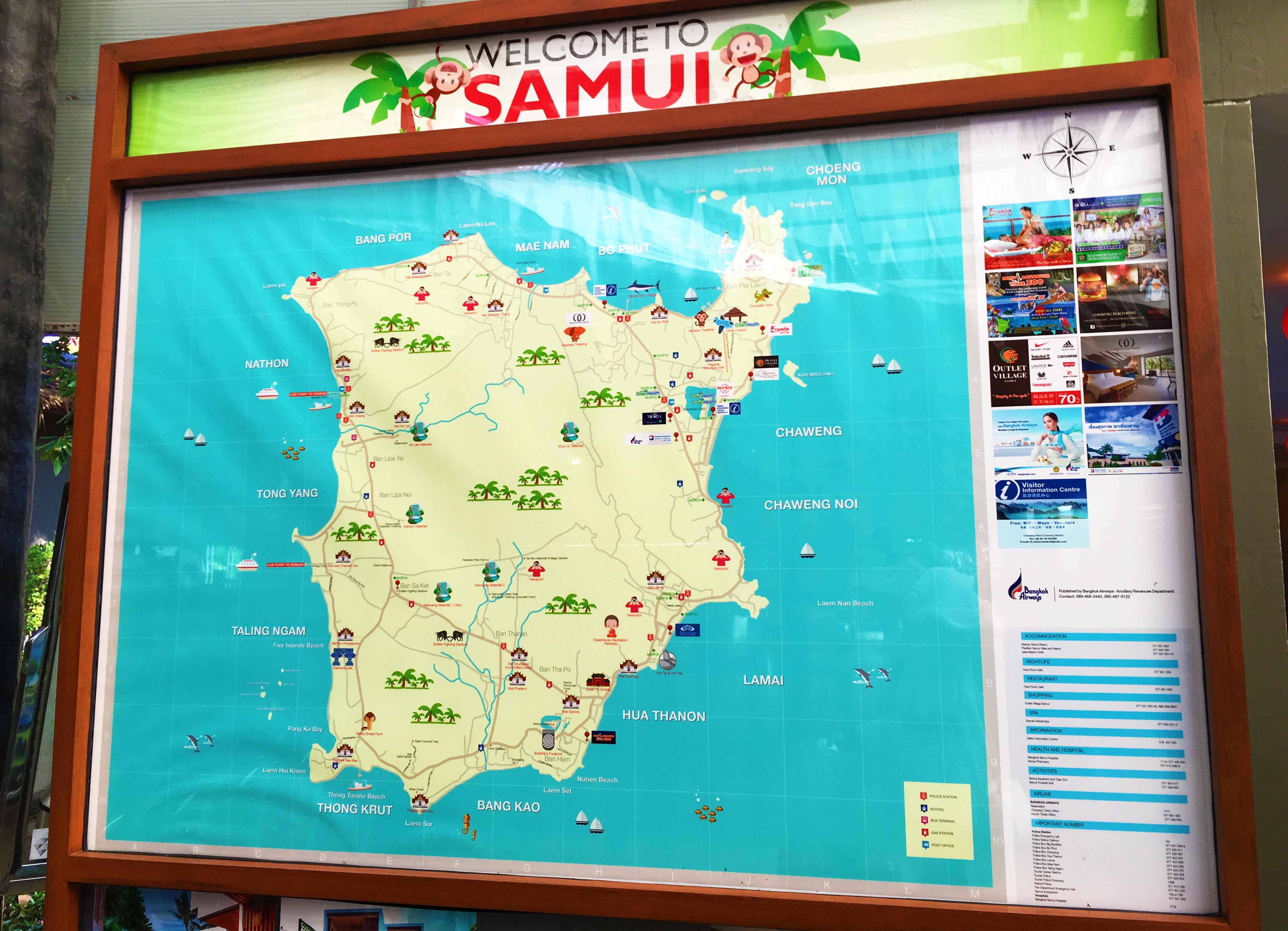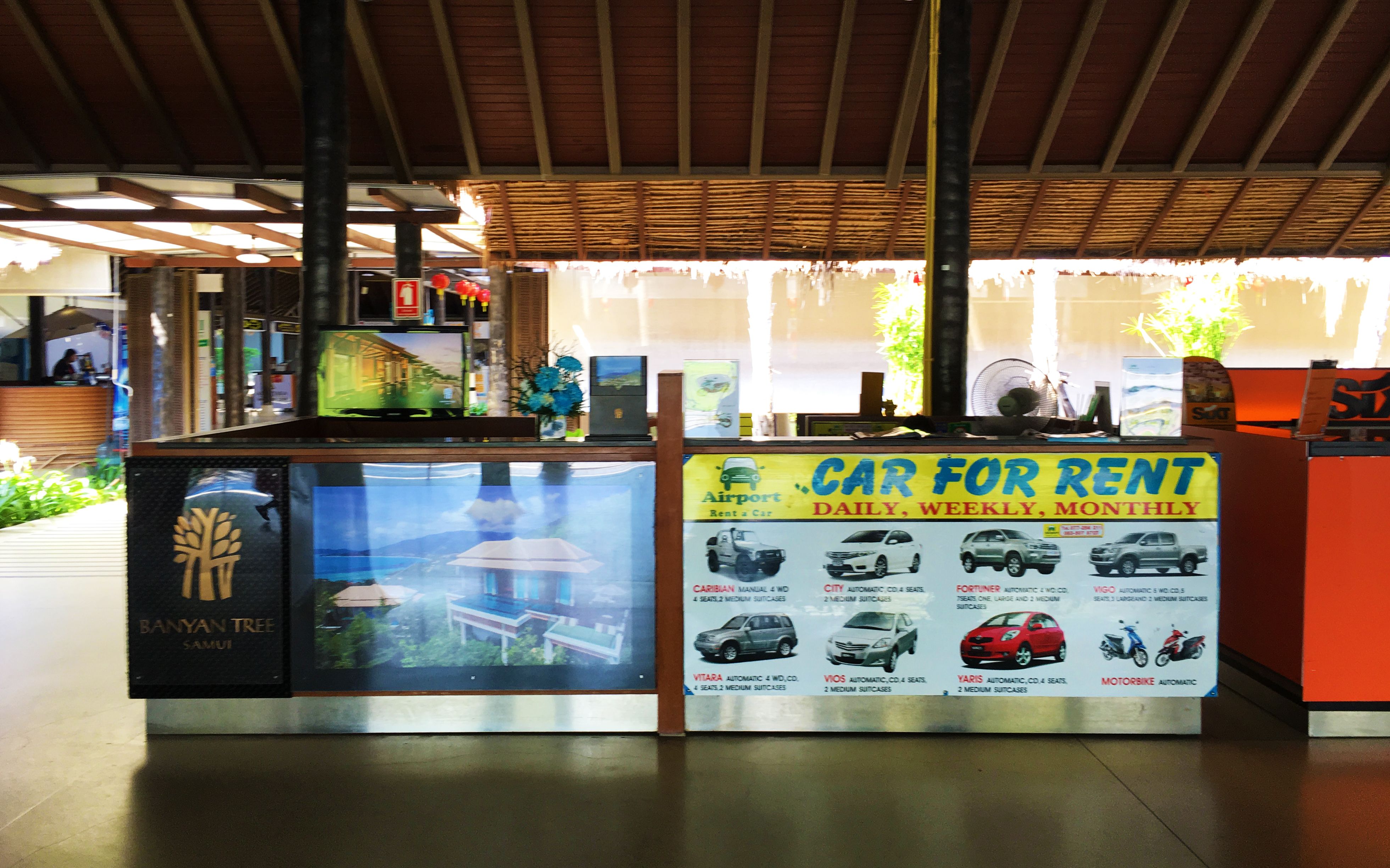 可以从地图上看到,岛上最繁华,酒店最多,水上活动最丰富的是岛东部的查温海滩,这个月牙形的海滩绵延6公里,十分优美。刚刚过去的中国年,机场还挂着红彤彤的灯笼,好鲜艳的色彩。每次来到海岛,我最享受的事情就是沿着海边开车了,所以在机场的出口,就有很多柜台提供租车服务。当然在网络上提前预订会比现场租车便宜很多,如果没有提前预订,最好在现场比比每家租车公司的价格,当然现场车的选择要比网络少很多。这次我选择了相对游客比较少,非常安静的湄南海滩的酒店。岛上贴心的摆了很多标示牌,让初次来到苏梅岛自驾游的我能很快找到自己的酒店,不会迷路。
