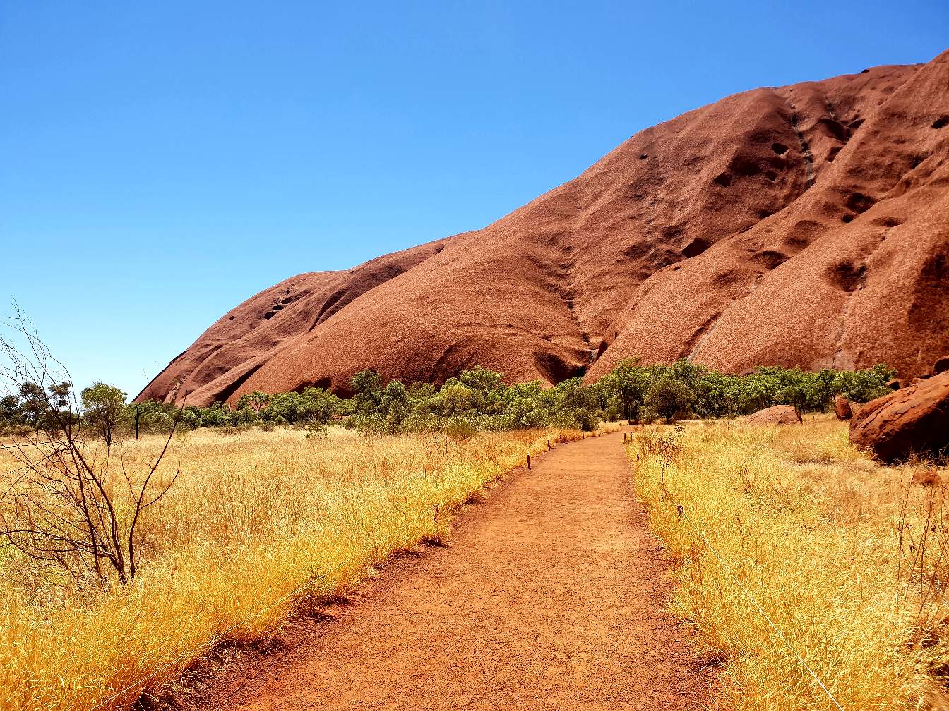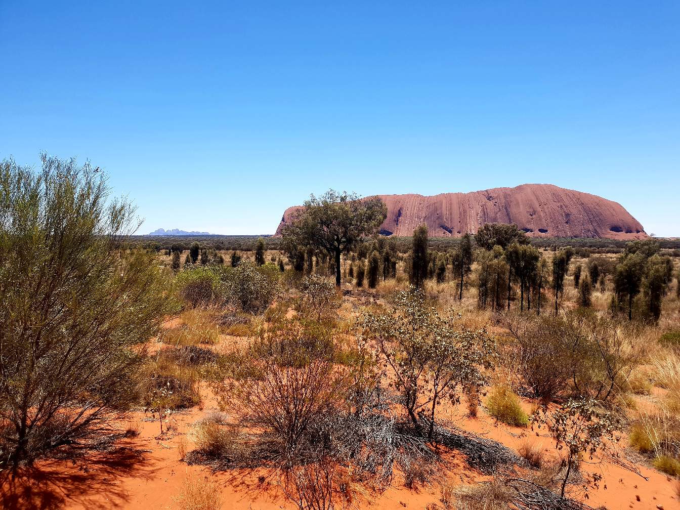 Standing proud in the middle of the Uluru - Kata Tjuta National park with only the Olgas/Kata Tjuta to keep it company. It makes you wonder how these amazing red rock formations came to be. Everything else is so flat, no mountains or big hills just the occasional raised sand dune. The surrounding area is littered with spinifex grass and Australian Bush trees providing a nice back drop to truly appreciate these natural wonders.
