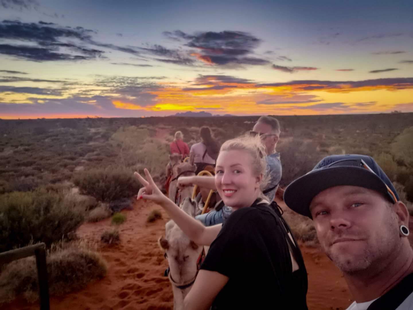 Once we are all aboard, we head off on our camel convoy. It's a nice leisurely ride as the camels dont like to exert too much energy. We stop and take some pics with Ayers Rock in the background. Then head up a dune to watch the sun slip below the horizon near the Olga's.