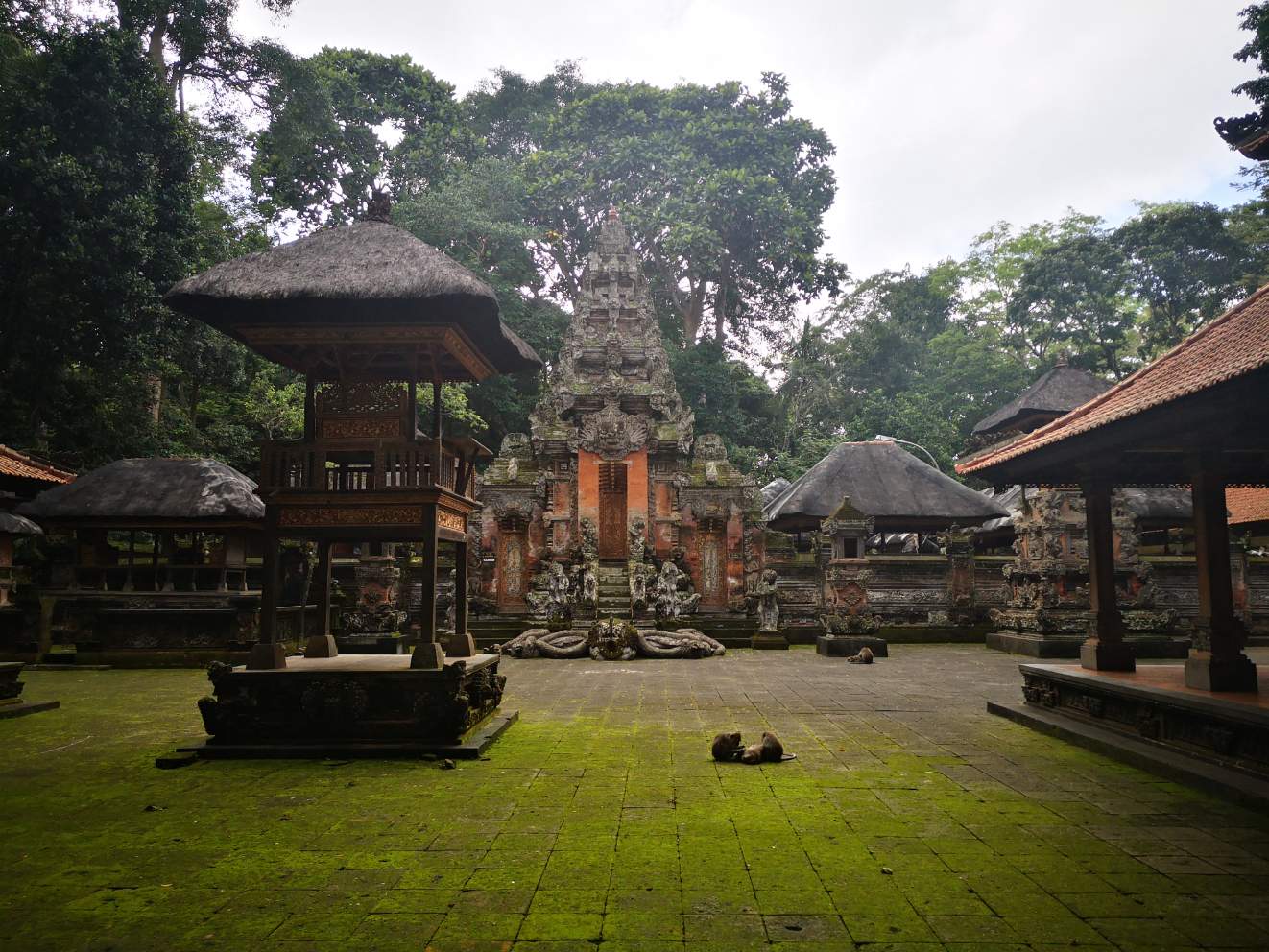 The splendid temple in the Sacred Monkey Forest of Ubud, surrounded by green trees where a large community of monkeys lives.
