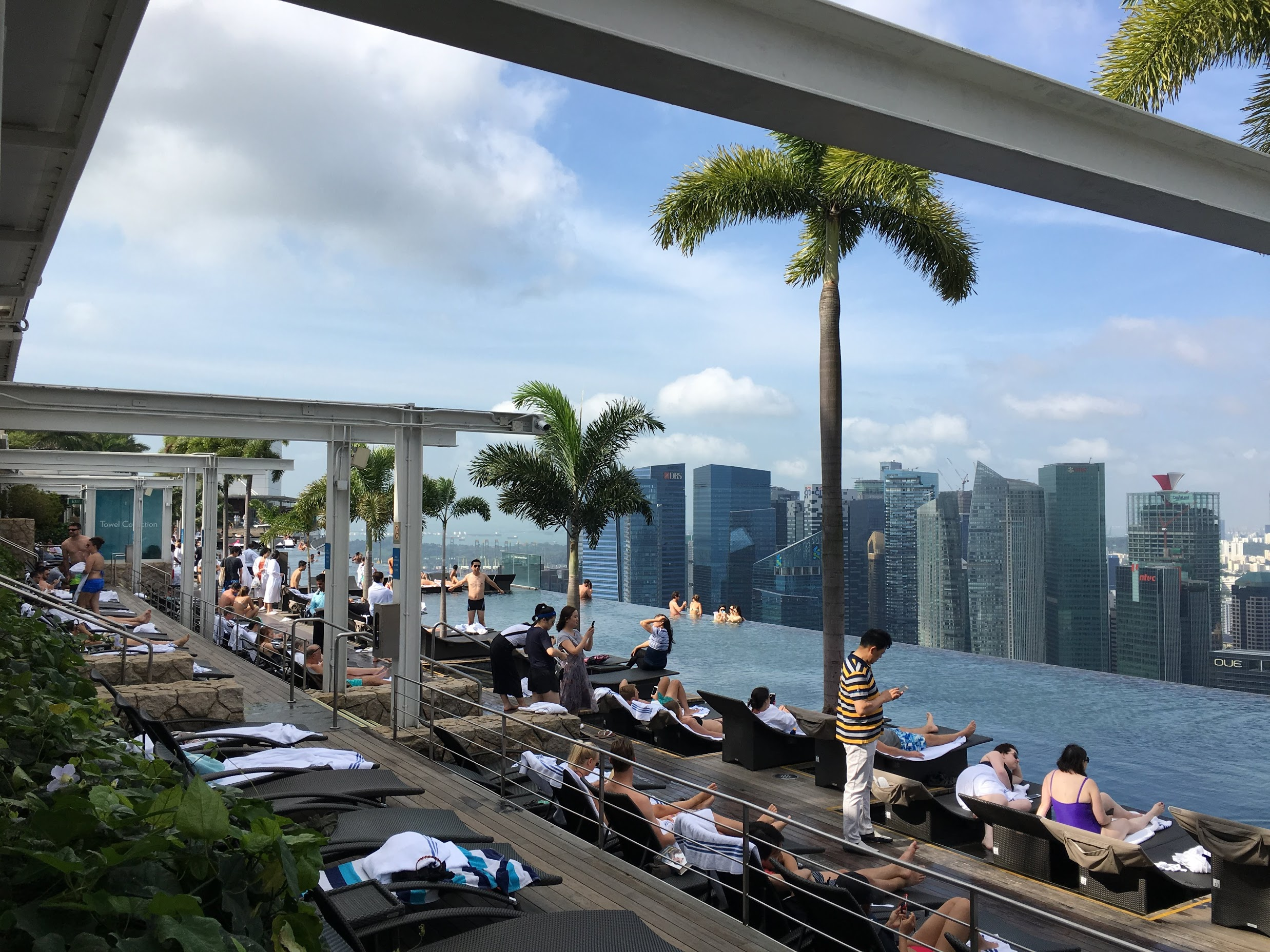 Now for the pool, despite our concerns, wasn't so crowded or disorderly and actually very well-kept given its grand size. The view was again every bit phenomenal and exactly what I had expected. My only complaint is that the pool water was a bit cold and hence it was hard to swim or spend long bits of time in the pool. There were also jacuzzis facing the Gardens by the Bay offering a different and equally intriguing harbor view of Singapore, but on a smaller side and crowded for comfort.