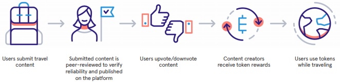Submitted content is peer-reviewed to verify reliability and published on the platform. The content undergoes the process of peer review and, once approved by other travelers, is stored on the blockchain and subsequently rewarded by tokens.