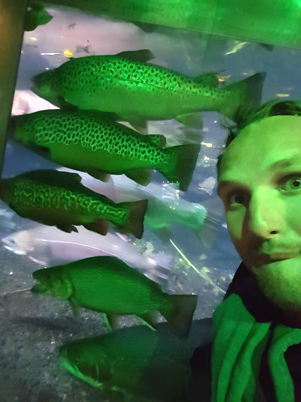 Rainbow Trout to be precise, I didn't realise how big they are, some of them are huge! There's a huge tank that goes into a pond, it probably contains about 50?!