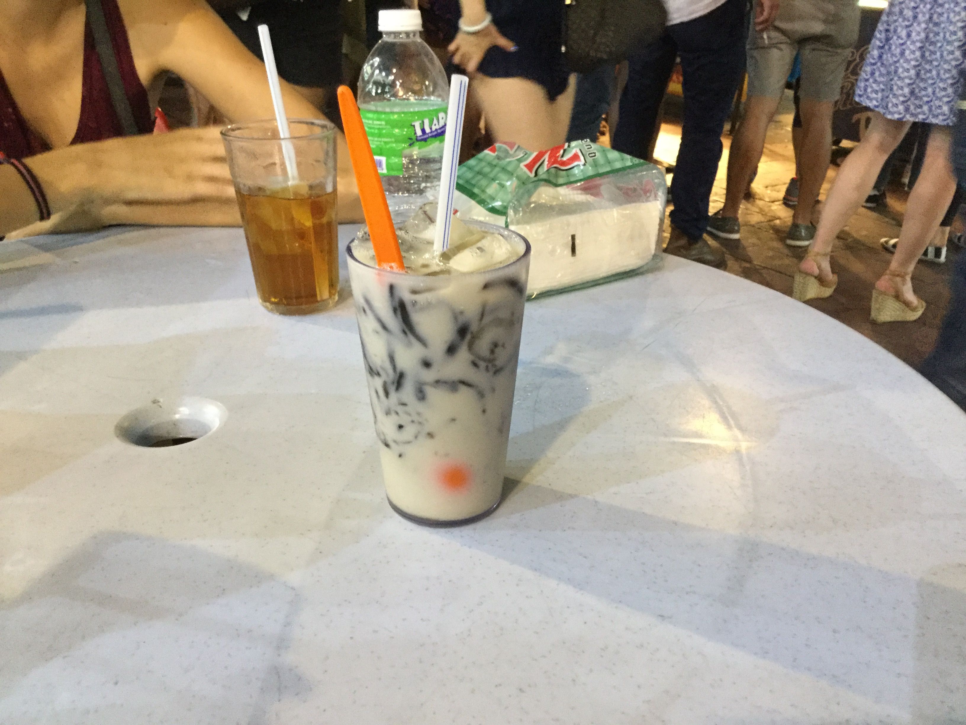 I tried a drink called Black and White. It was a milk drink with these dark, jelly, lumps in it. The dark jelly lumps are a popular dessert in this region, they're served on crushed ice. It wasn't horrible, but it was very sweet. Javier and Svenya didn't like it either. I could only drink half of it before I gave up. It was only about 30 cents in US dollars.