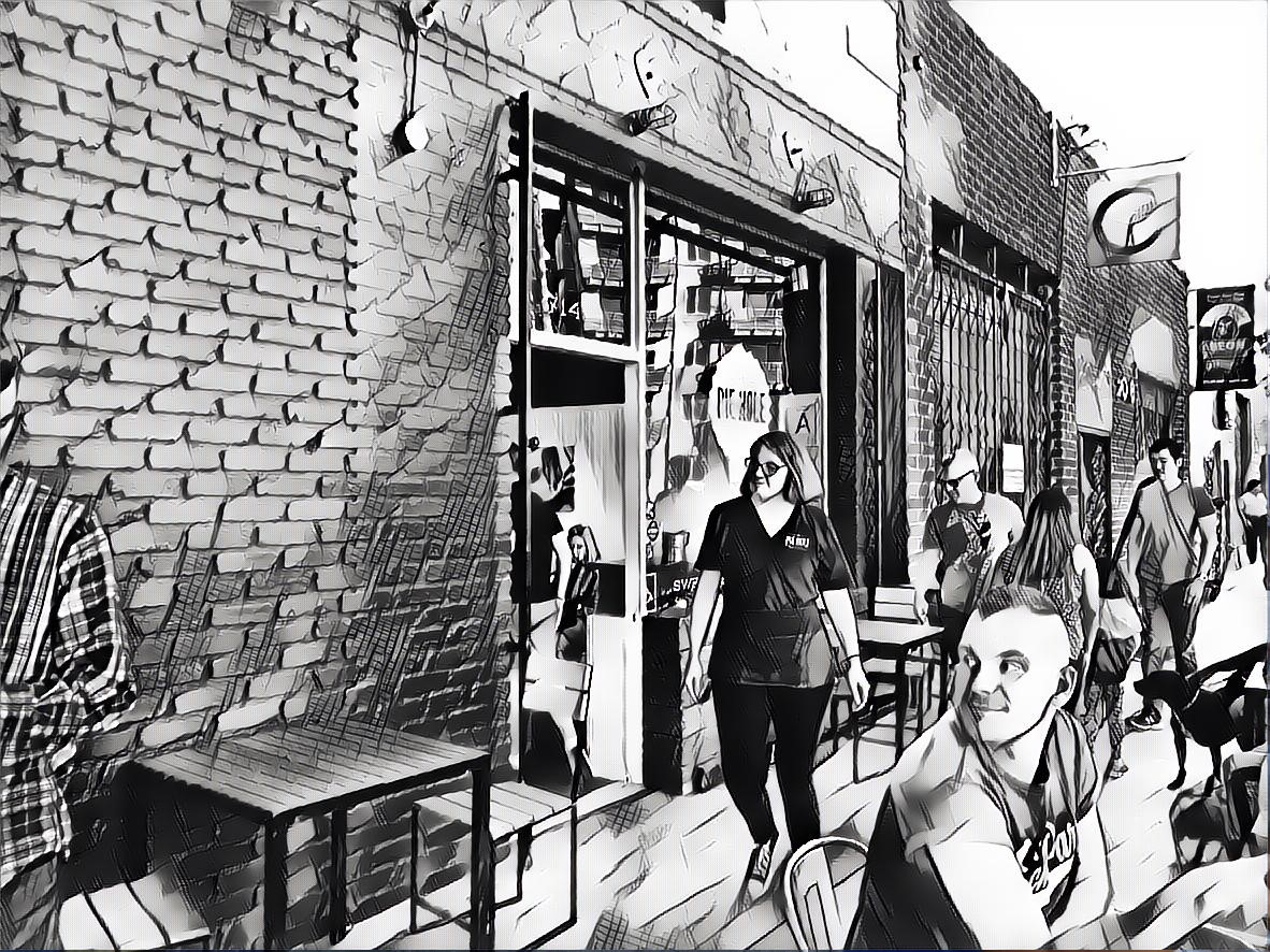 One: The Gardens; the preceding image is the giant mural that looms over it, and the picnic tables people sit at. This place has chickens!