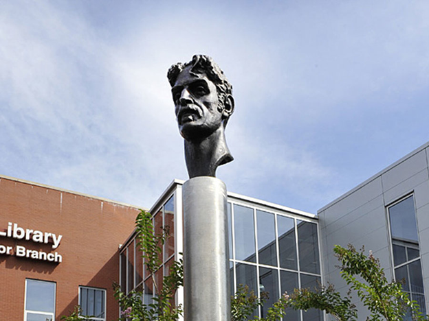 A bronze bust of Frank zappa atop a stainless-steel pole