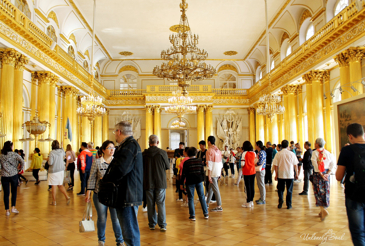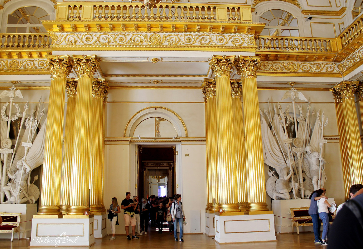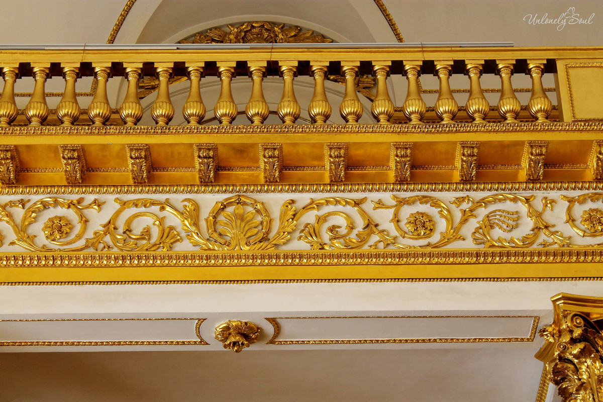 The majestic Armorial Hall is one of the largest rooms of the Winter Palace. The hall is pretentious, decorated in white and gold colors, which creates a sense of calm grandeur. Gilded columns are placed around the perimeter of the hall, balconies with a balustrade under the ceiling.