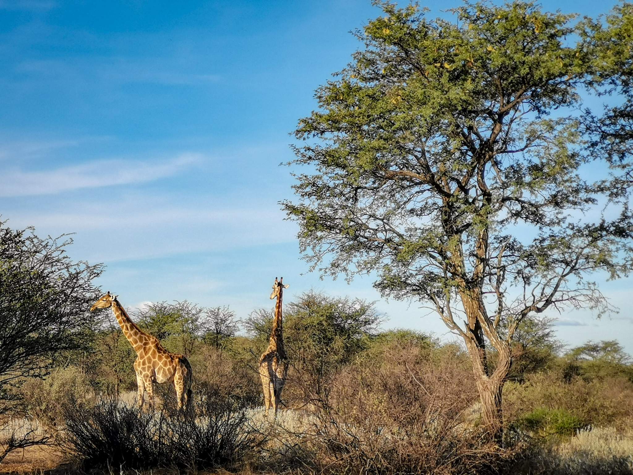 As we walked around the bush following the animal foot prints we turned a corner around some bushes and there they were.. two giant giraffes!!