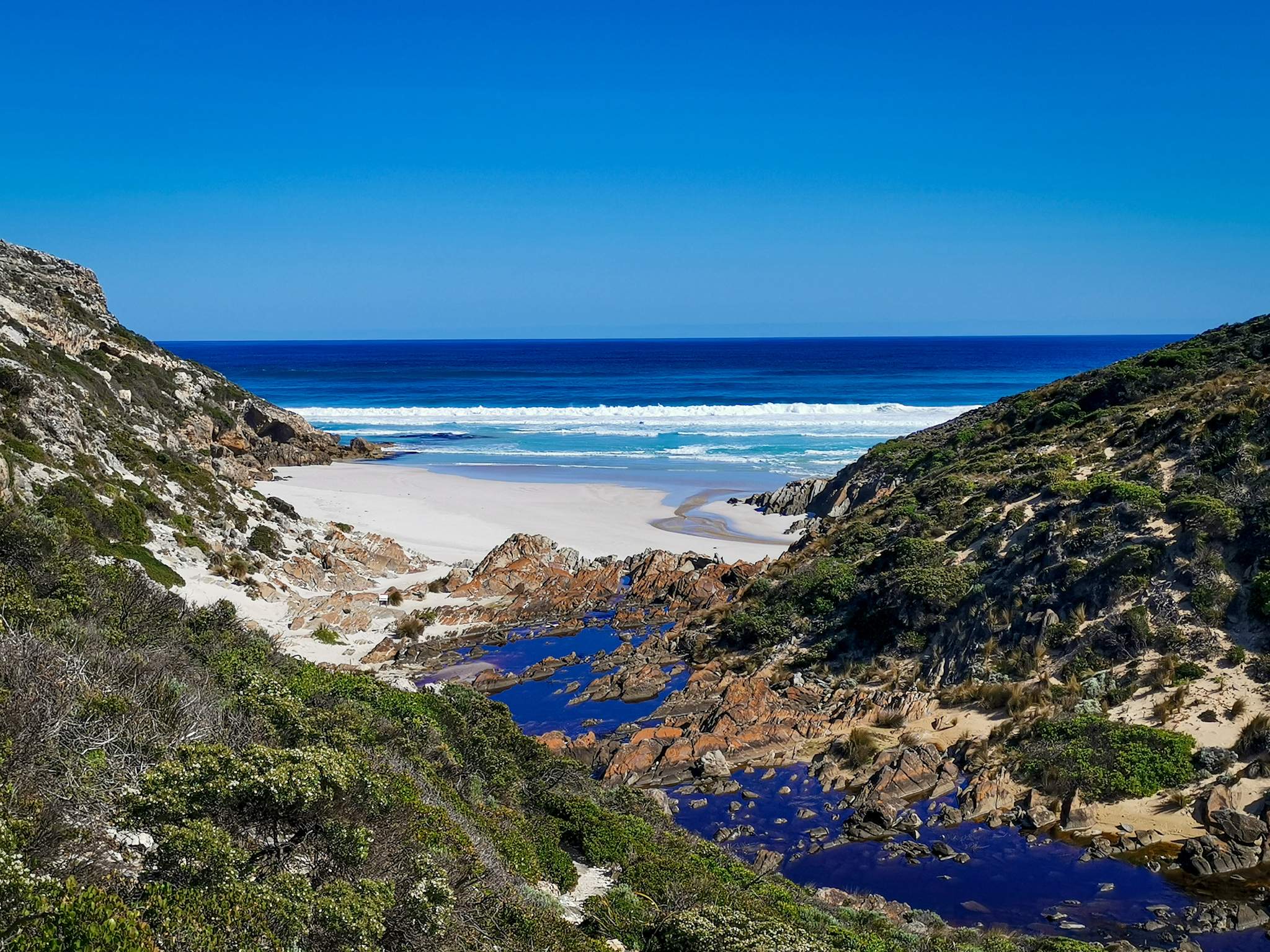 The point where snake lagoon meets the southern ocean on Kangaroo Island in South Australia. We took an amazing walk to snake lagoon then followed the creek which ended up on this empty beach. It was the best spot to relax and take In the scenery.