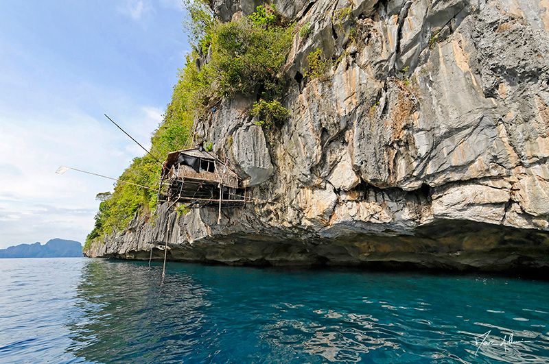 Cliffs made aggressive by a cutting rock, added to that a verticalness guaranteeing them an almost impossible access, we understand then quickly that the only ones who can pretend to regularly access these islands are our feathered friends. Among them, a species of "swifts", commonly called "swallows" (Why ?!), with the ability to secrete mucus for the design of their nests. The particularity of this mucus is to display the price of 200 000 php/kg (= 3300 €/kg) in the markets of traditional Chinese cuisines. At this price, it will be understood quickly that the owners of concessions do not hesitate to afford the luxury of "guardians of nests" royally paid 80 to 100 € per month. These guards are responsible for staying days and nights near the concession and to prevent unwanted visits. A mattress in the hollow of a rock, a cabin on one of the few beaches, or real small houses surprisingly fixed on the walls of the cliffs, their places of life seem surreal. Ramon and Aton, aged 15 and 17, have to stay 60 days in a cabin set 10 m above the sea. A rope to access the terrace, another to hoist the canoe, a bench on the ground as a bed, the picture of Miss beer 2009 displayed on woven walls and soon rotten, a corner of rock to isolate half a barrel used for cooking, this is the home of these two young guardians, happy to have a job. They live in the small village of Coron-coron located three hours of oar where one of them goes from time to time to seek water and food. Fishing, cigarettes and forced weight lifting, are the main distractions on this terrace with breathtaking views. Highest activity today, Aurora's visit. The tea is served, the packets of biscuits are consumed at high speed, and their eyes let me guess how could shine my eyes when in my turn I visited their house so particular. A meeting, short exchanges, everyone separates, everyone is happy, easy and sufficient.