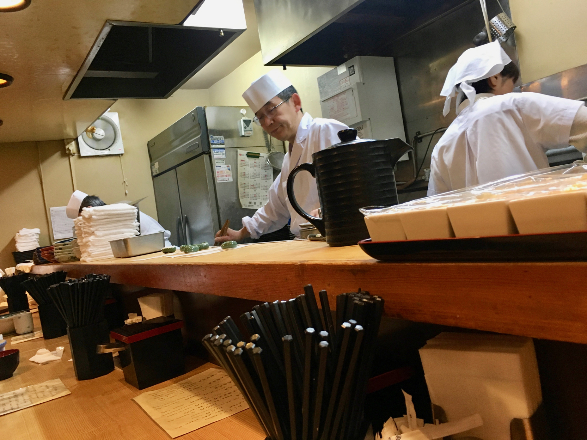 It's noon, I'm getting hungry. Taking a perpendicular street I notice a restaurant specializing in tempura. Although many restaurants offer tempura, I absolutely wanted to try one specialized in this type of food, with the chef who cooks in front of me. At the entrance, the menu is written only in Japanese, and with a handwriting illegible for me. Never mind, it is precisely to enter such places not frequented by tourists that I came to Japan.