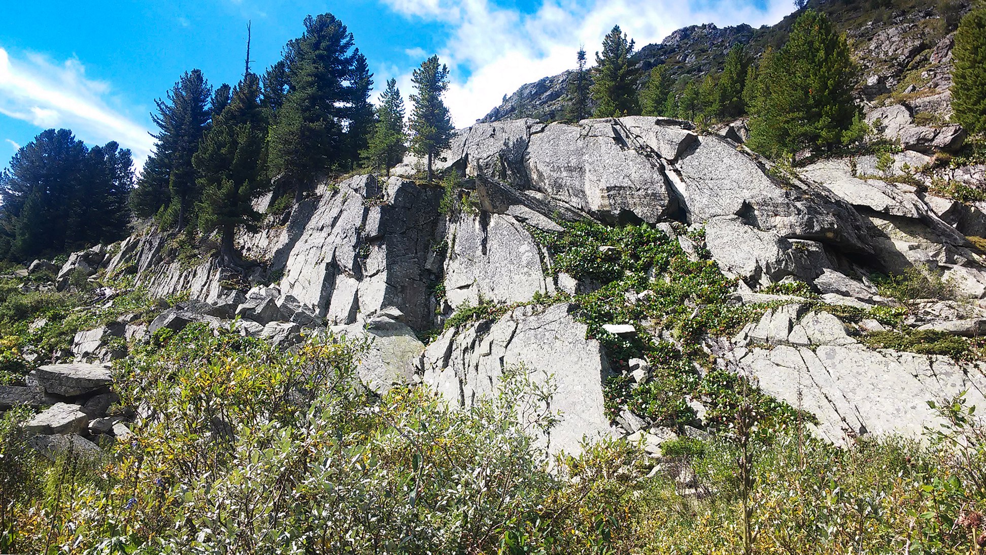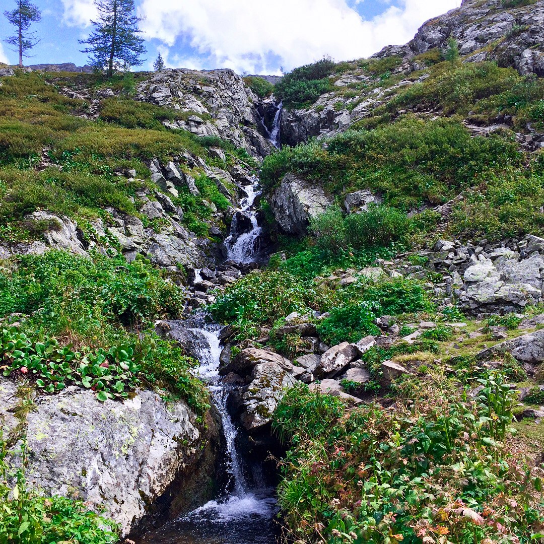 On the way I saw a waterfall flowing from the first lake. Also on the road there were large stones covered with spots of green moss, it looks unusual. Along the waterfall lies a path leading to the first lake.
