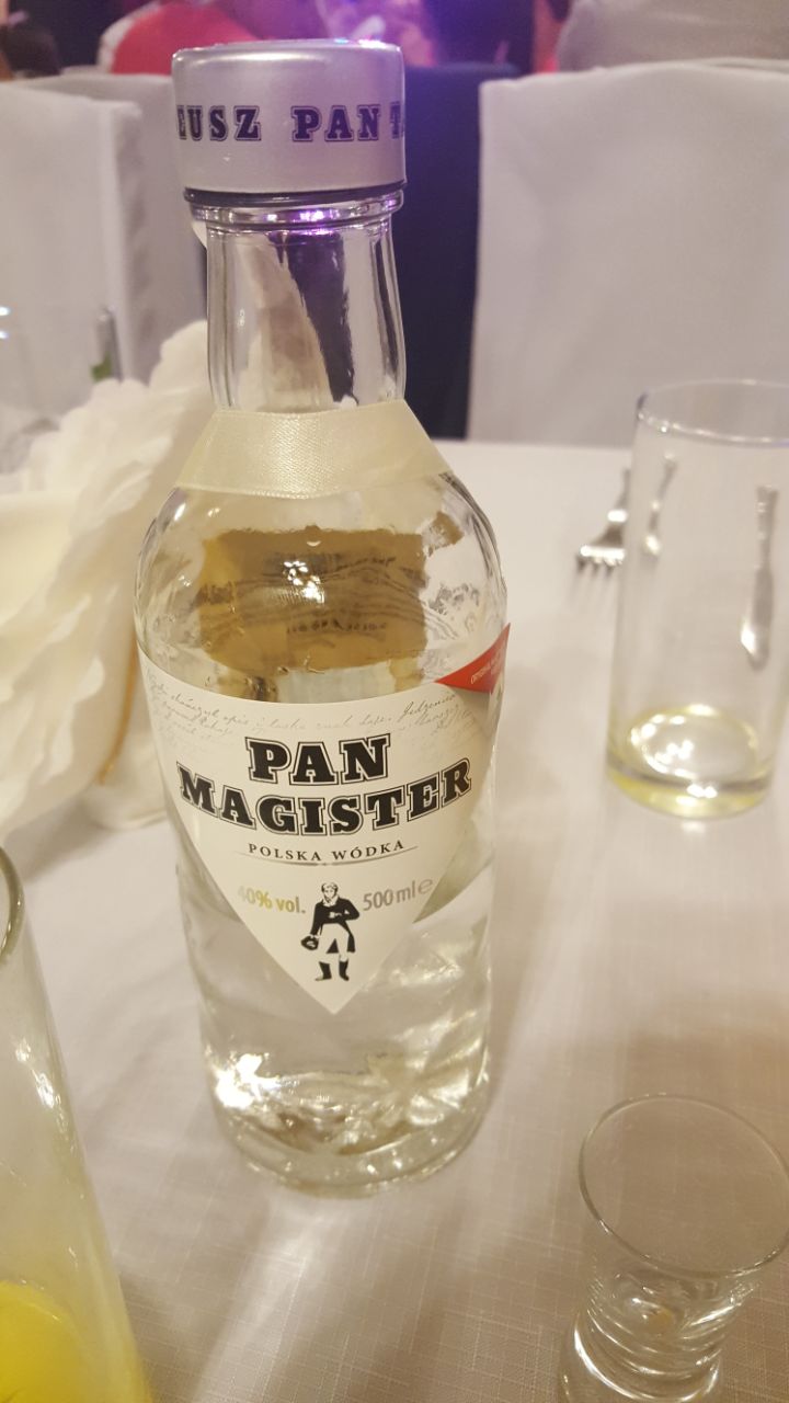 Una volta che ci siam resi conto dove dovevamo sederci e consapevole di quello che mi sarebbe successo... stavo già guardando sui tavoli per vedere quante bottiglie di vodka avevano messo. Stranamente non c'era neanche una bottiglia e la cosa mi stava rassicurando dato che come e' ben saputo ai matrimoni Polacchi la vodka regna sovrana. Purtroppo per me, non appena ci siam seduti, i camerieri hanno iniziato a portare le bottiglie di vodka che venivano posizionate ogni 4 persone. Ora come avrete visto dalla foto della vodka a 40gradi.. mezzo litro in 4 persone e' tanto... se poi aggiungiamo il fatto che oltre a questo accanto a me c'erano solo bambini e ragazze ( la mia ragazza, le sorelle e qualche cugina) la situazione stava precipitando.
