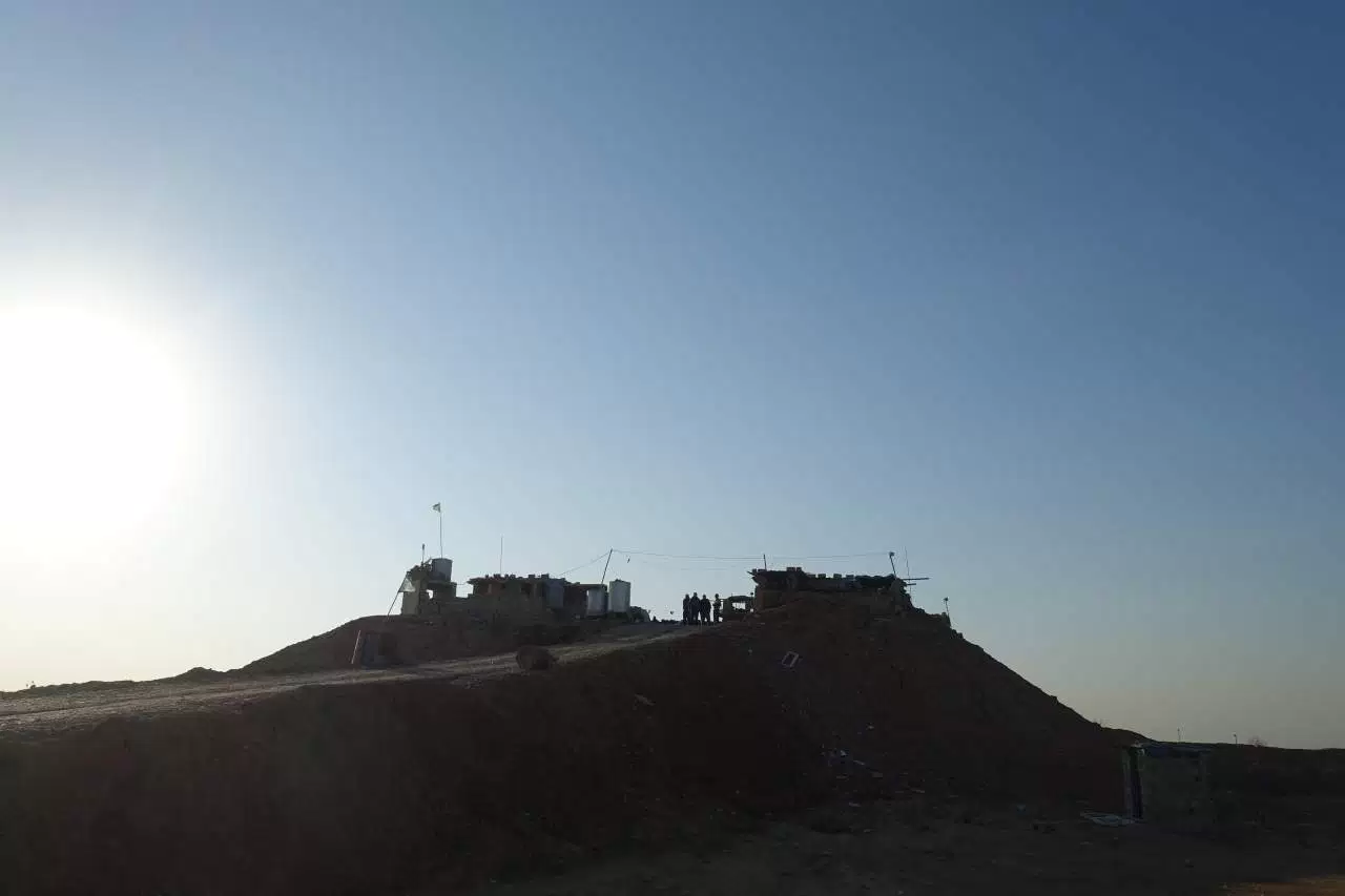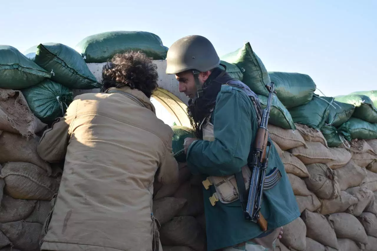 Large embankment after large embankment, all decorated with concrete outposts and smiling soldiers, we saw a village up in flames about 600m out from the front line, smoke towering above. We drew close to an intense mound, larger than those we had just passed where we were met by two decorated militants. We were here. In the thick of it. Only 300m ahead of us were ISIS, flags waving but silent and heavily dug in. At night they made their assaults under the cover of darkness.